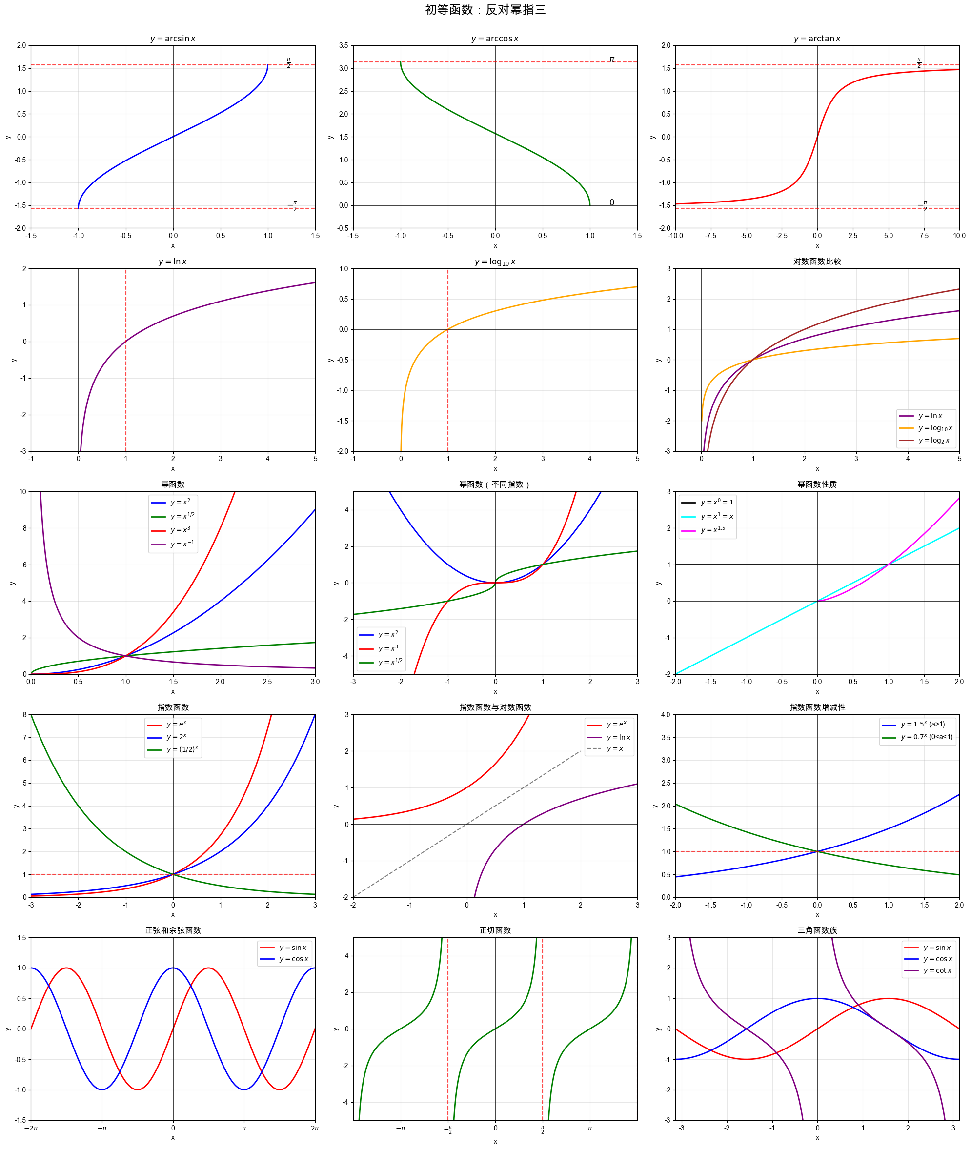 | 指数函数 e^x | (-∞, +∞) | (0, +∞) | ↗ | 非奇非偶 | 无 | e^0 = 1 |