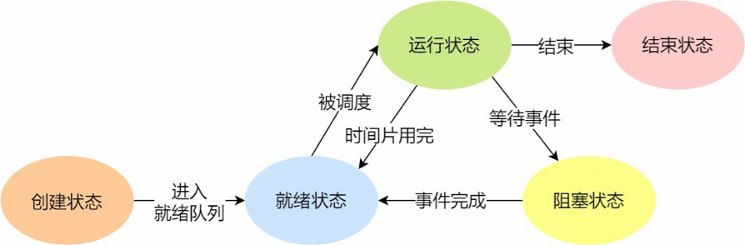 • 就绪态 Ready:进程获得了除处理机外的一切所需资源,一旦得到处理机,就可以立即运行