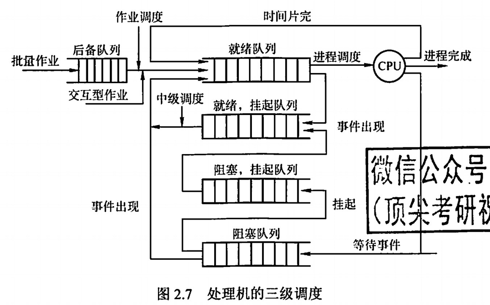 • 作业调度:多道批处理系统中,有新的作业放入内存时,会为其建立一个新的进程