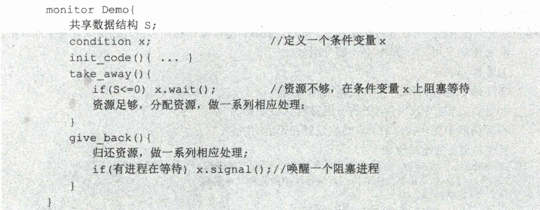 • 定义:将一个进程进入管程后被阻塞的原因定义为条件变量 condition