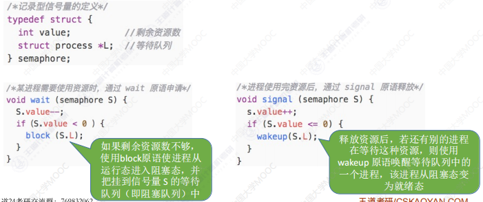 • wait/signal 类似于信号量的 P/V 操作,实现进程的阻塞/唤醒,但不能说和 PV 操作相同