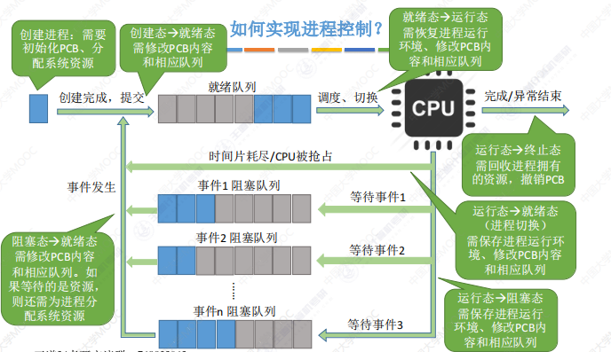 • 进程控制:主要功能是对系统中的所有进程实施有效的管理,具有创建新进程、撤销已有进程、实现进程状态转换等功能
