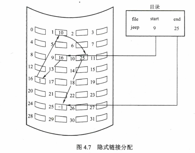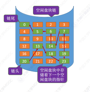 - 当用户请求分配存储空间时:系统从链首开始,依次摘下适当数目的空闲盘块分配给用户