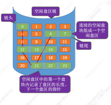 - 每个盘区含有下一个空闲盘区的指针和本盘区的盘块数