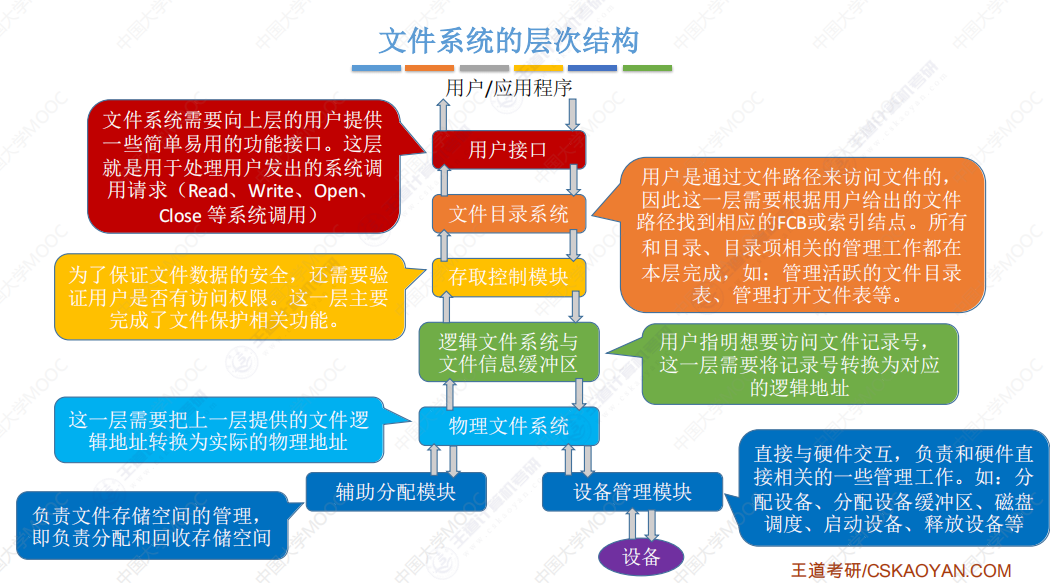 - 文件存储设备的管理实质上是对空闲块的组织和管理,它包括空闲块的组织、分配与回收等问题
