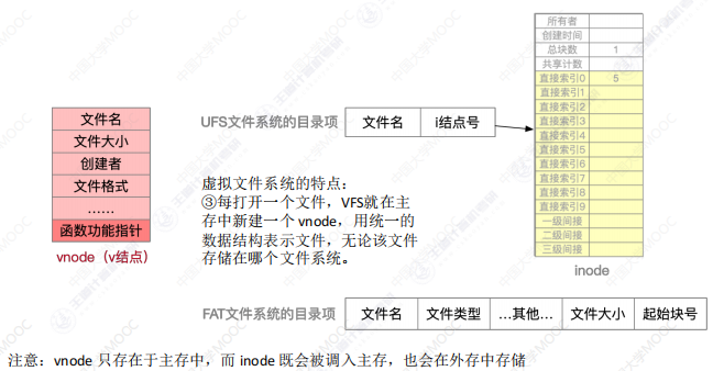 - 每打开一个文件,VFS 就在主存中新建一个 vnode,用统一的数据结构表示文件,无论该文件存储在哪个文件系统【vnode 的功能指针指向具体文件系统的函数功能】