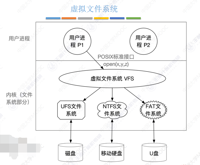 - 虚拟文件系统(VFS):屏蔽了不同文件系统的差异和操作细节,向上为用户提供了文件操作的同一调用接口