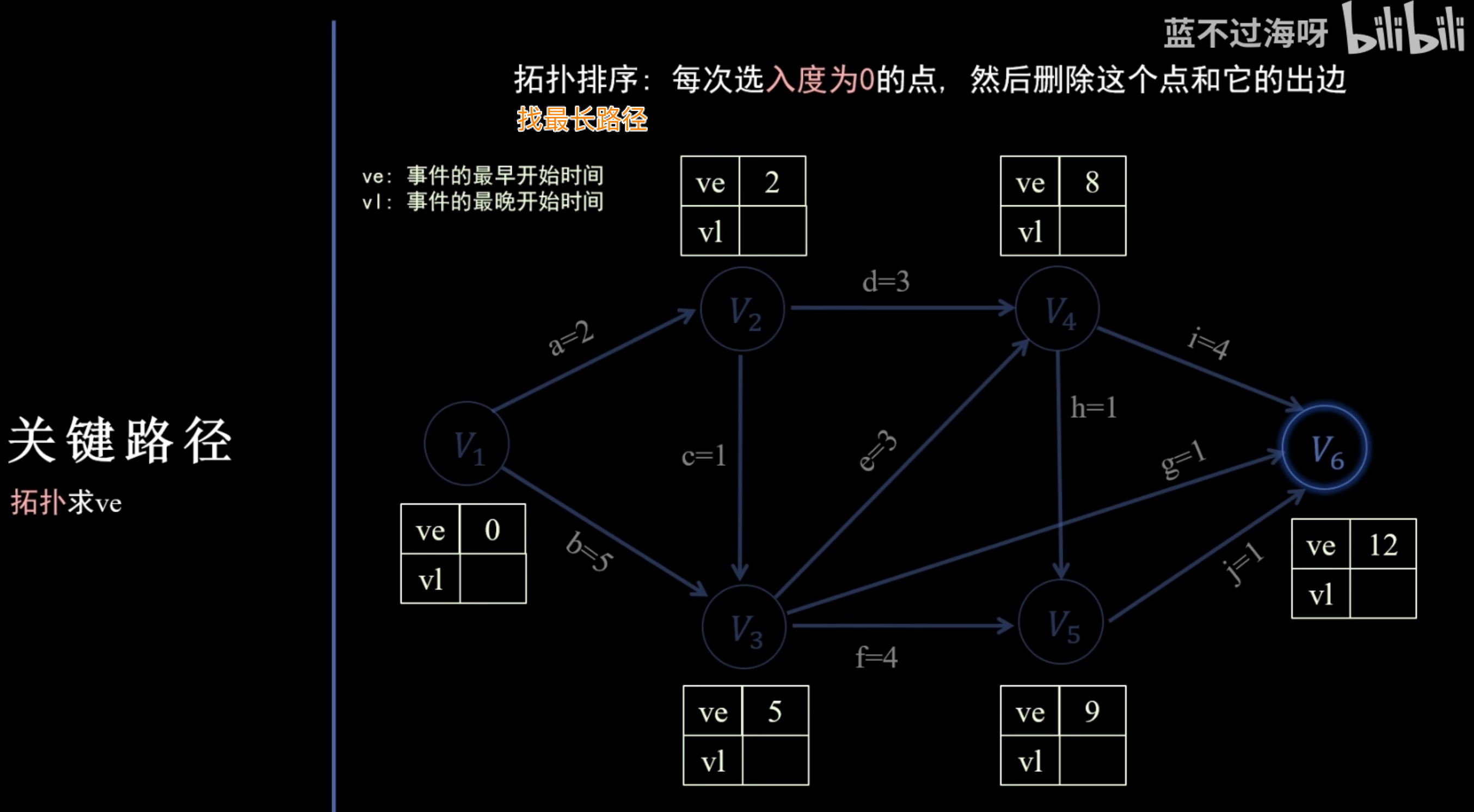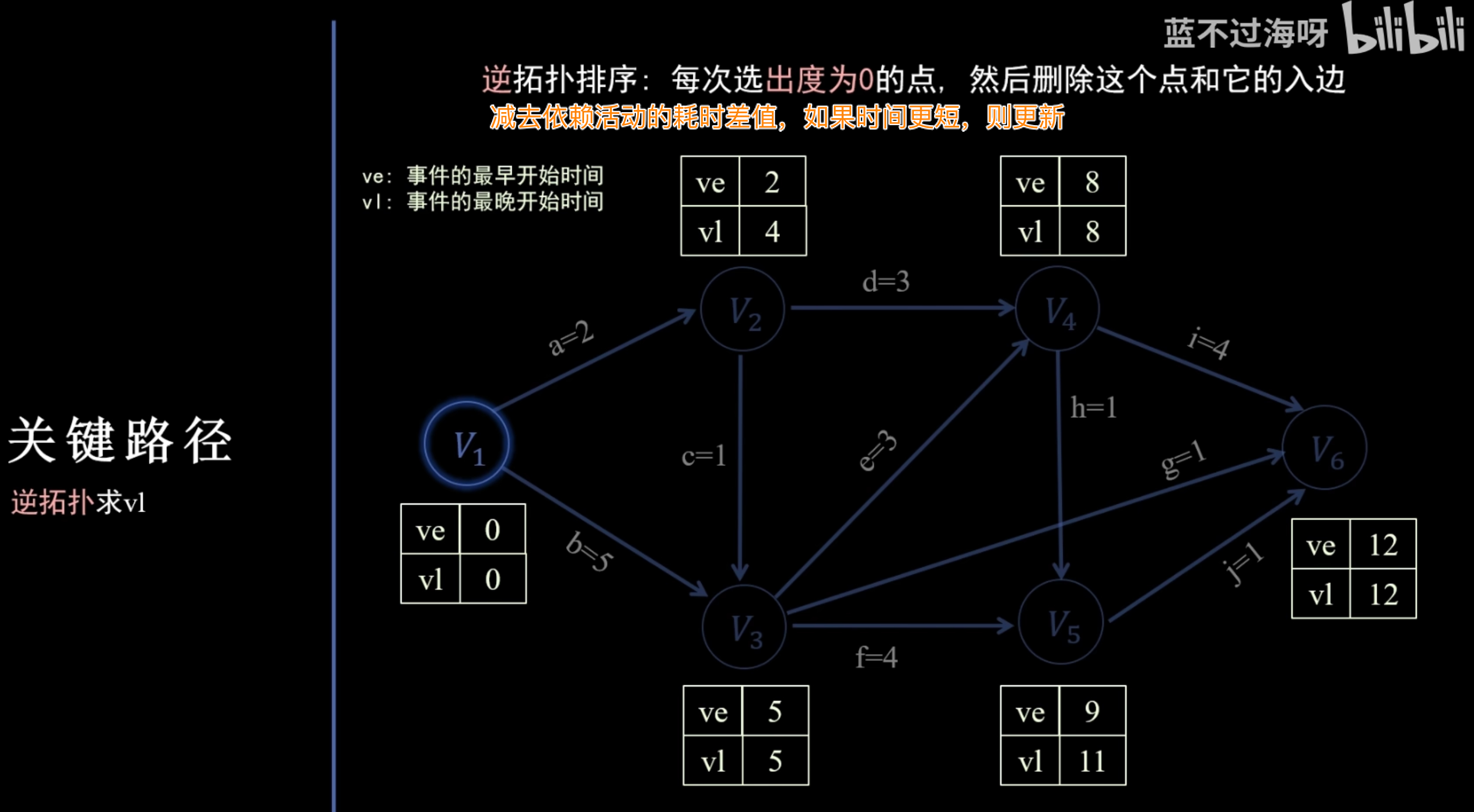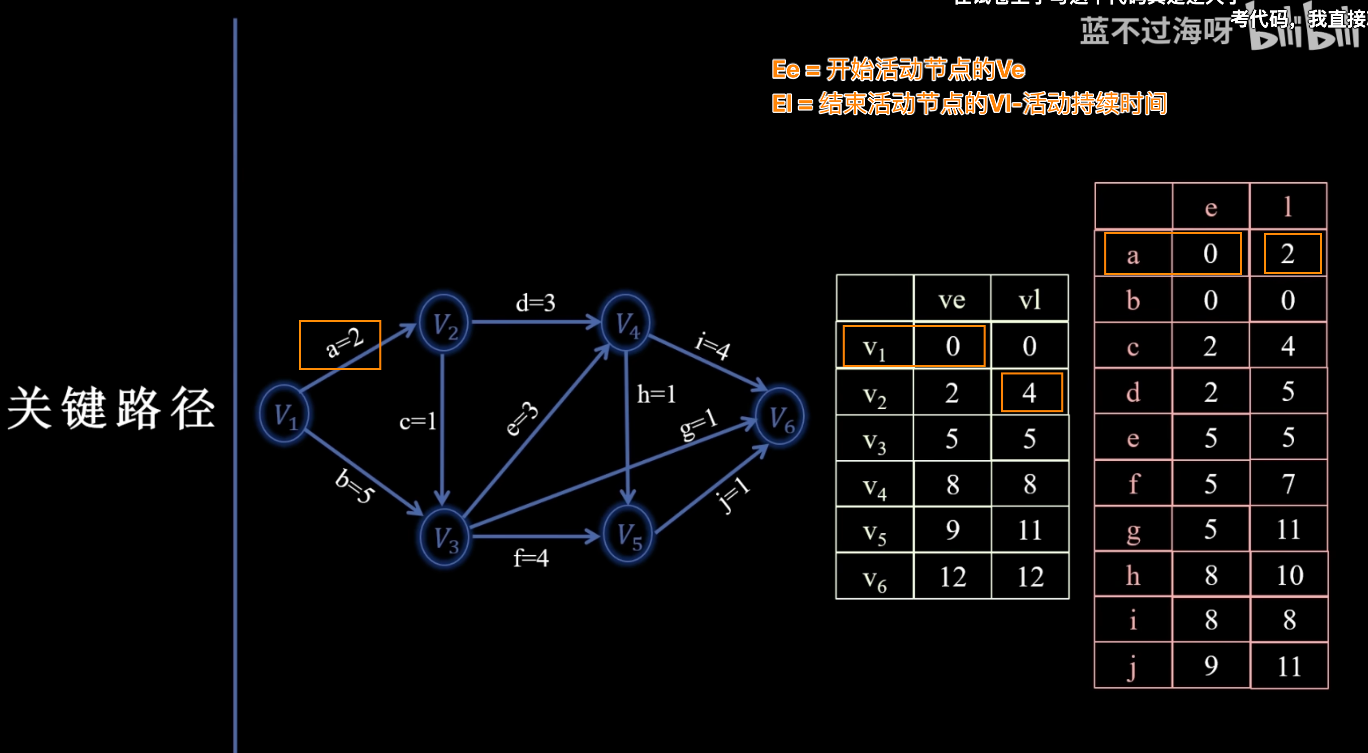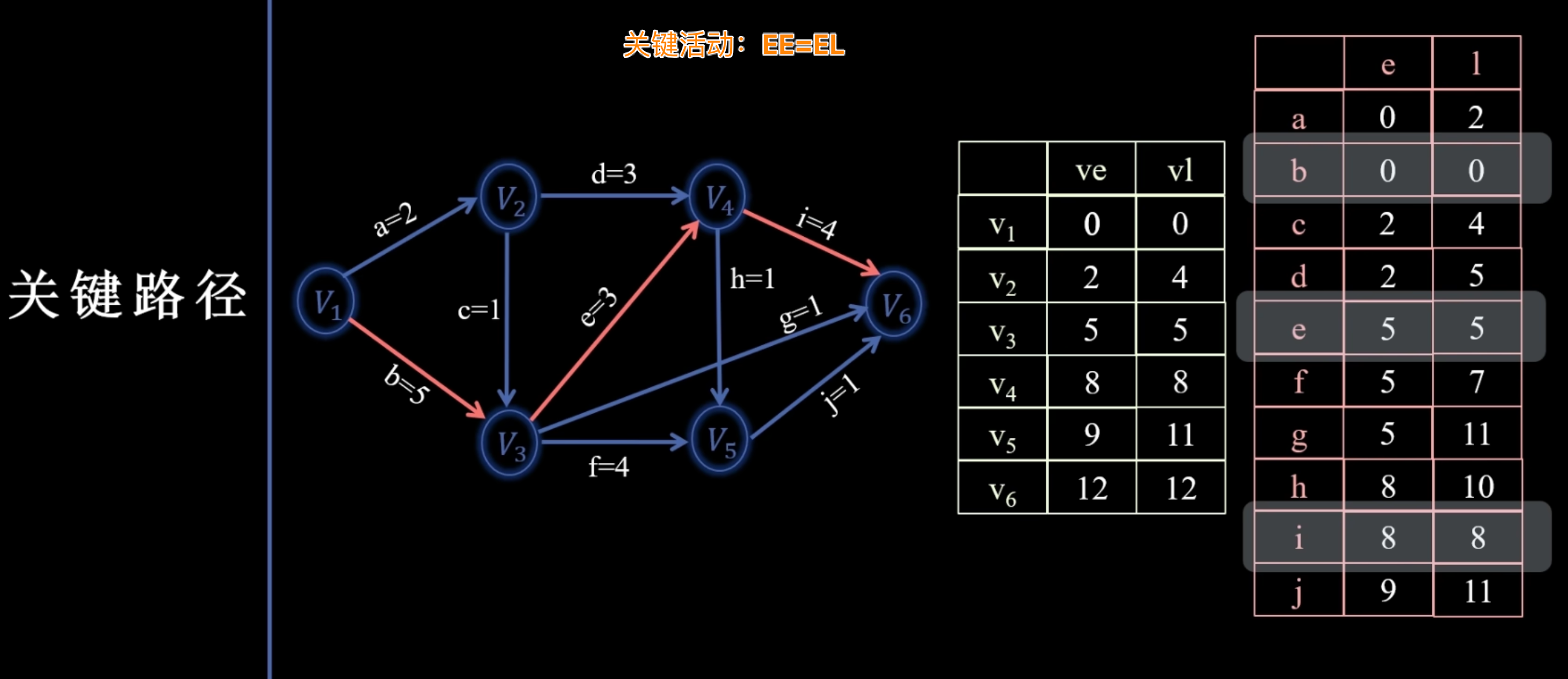 - 关键路径:由一系列关键活动组成的路径。一个 AOE 网可能有多条关键路径。