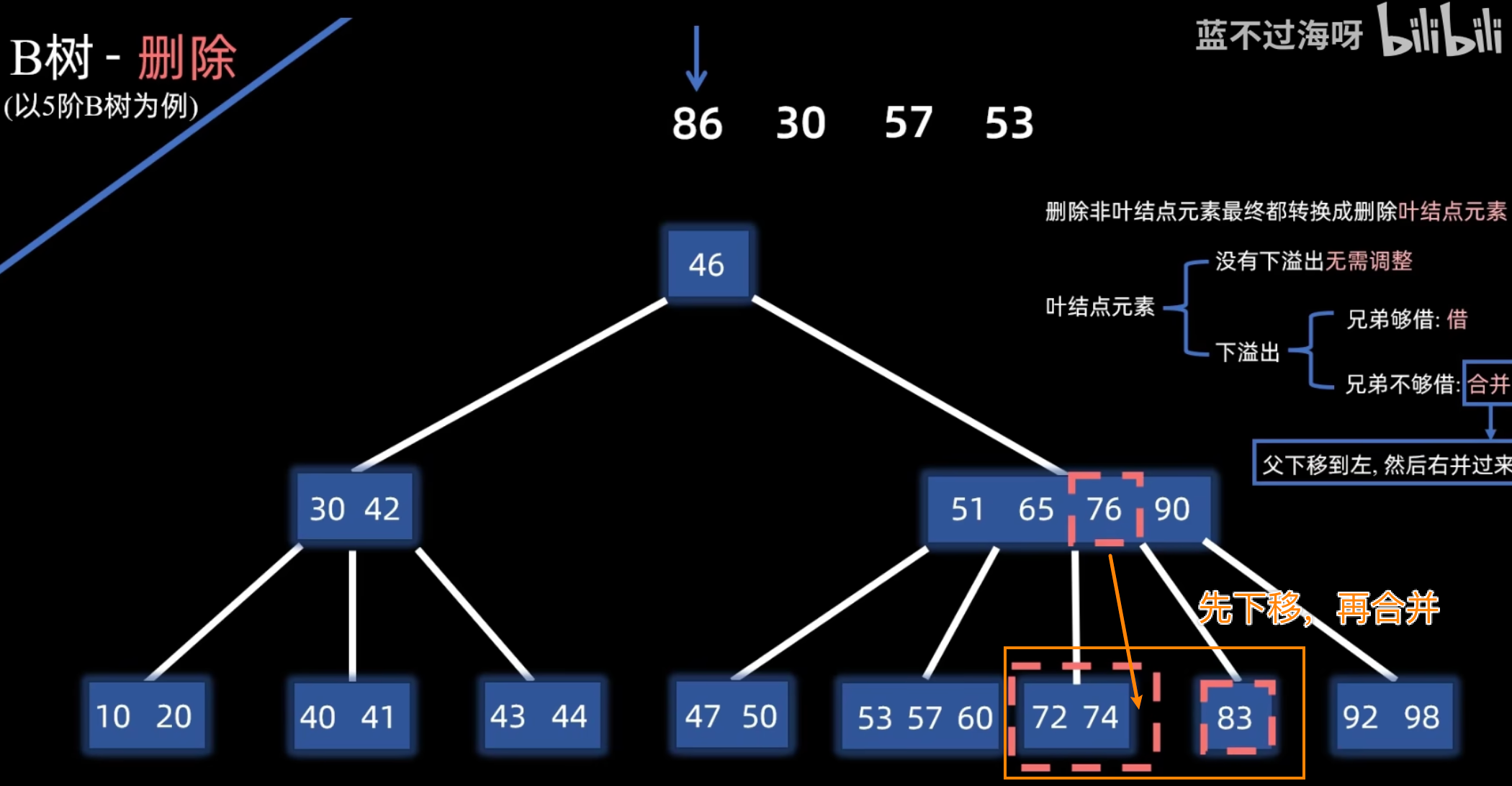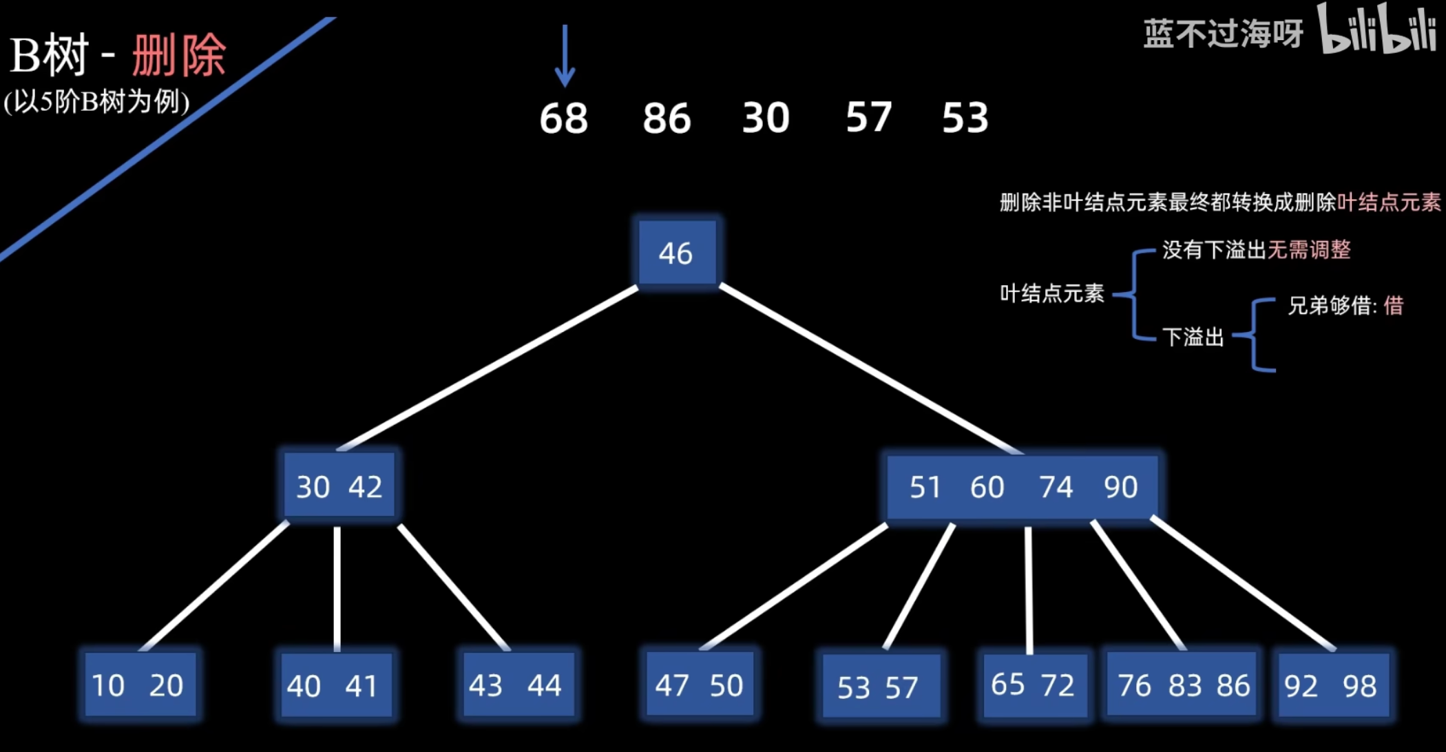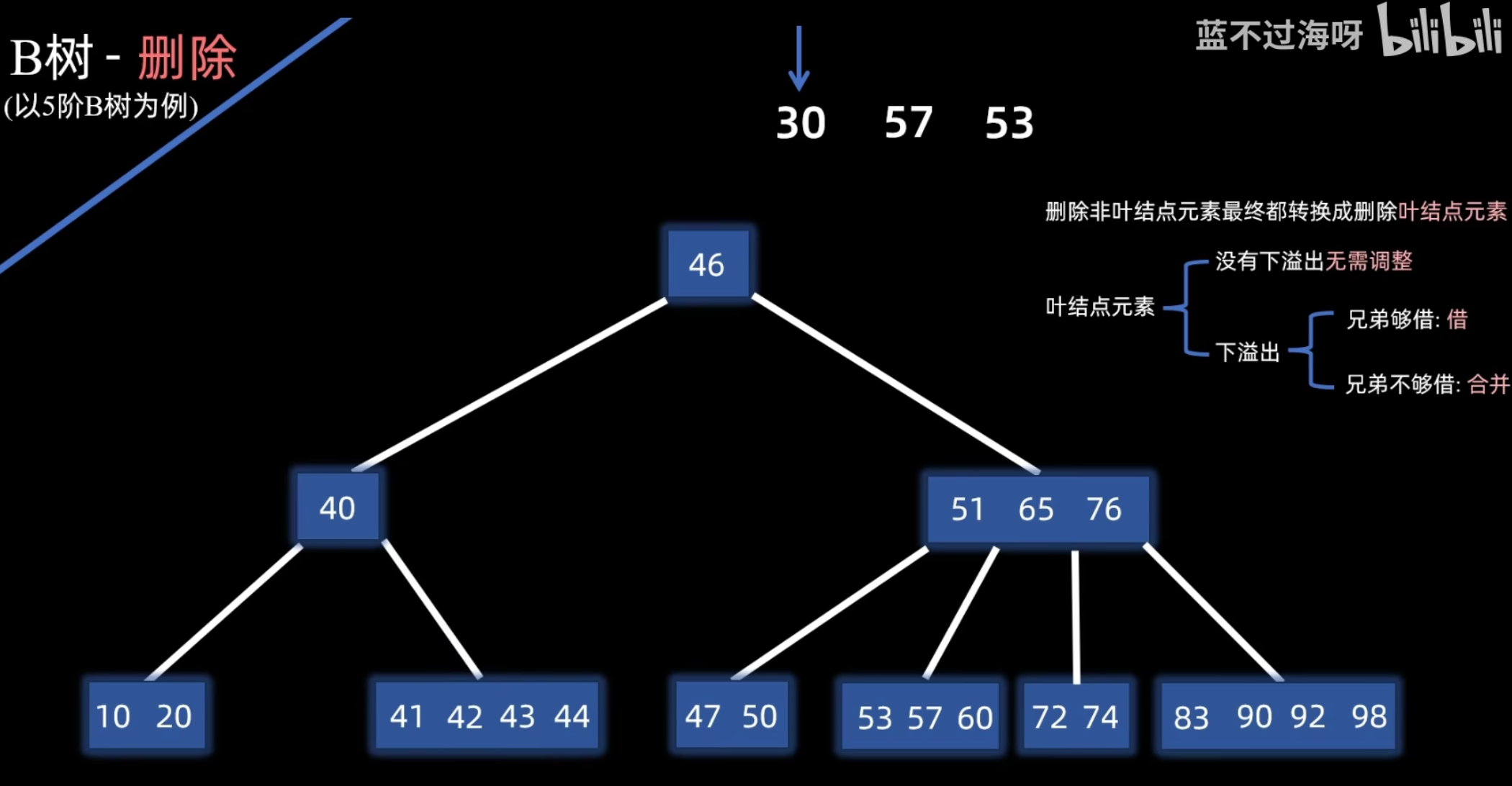删除操作比插入复杂,因为它可能需要合并 (Merge)借用 (Borrow) 关键字来维持 B 树的性质。