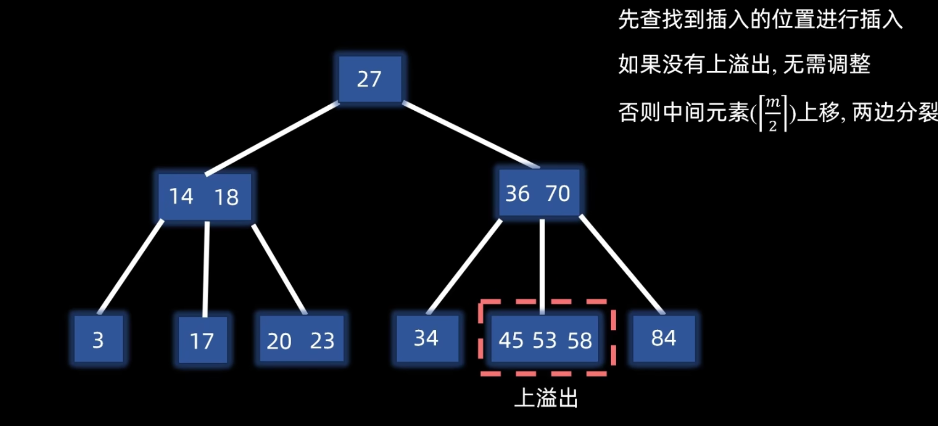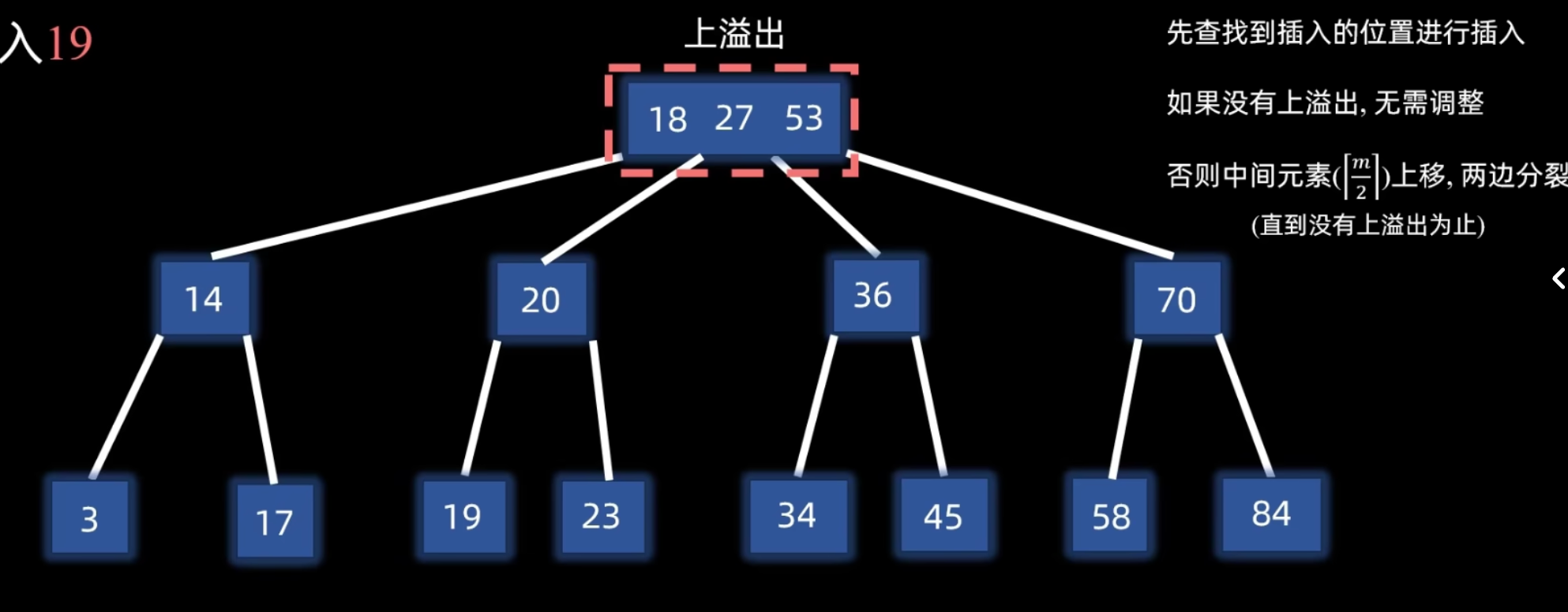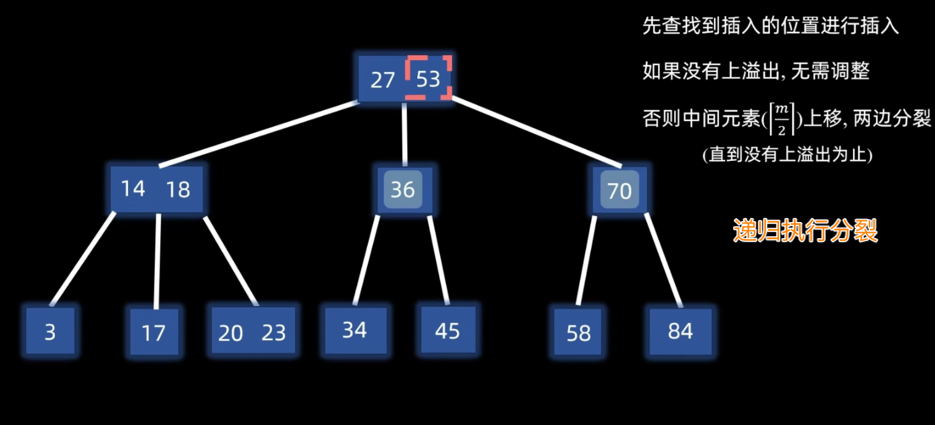 4. 递归分裂:如果因关键字提升导致父结点也溢出,则对父结点重复分裂操作,直到不再溢出或分裂到根结点。若根结点分裂,则树的高度增加 1。