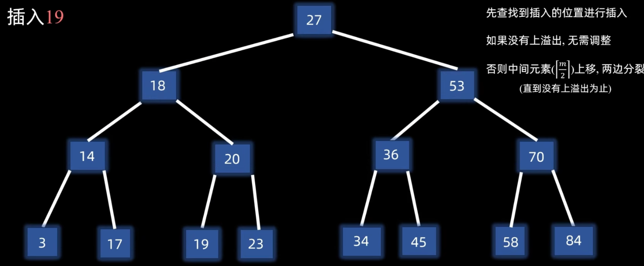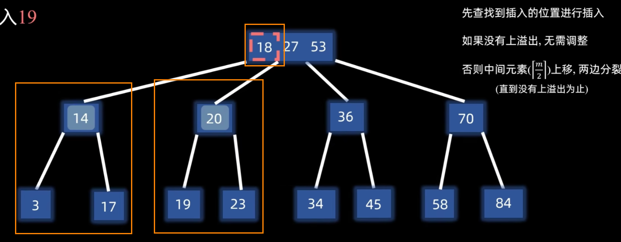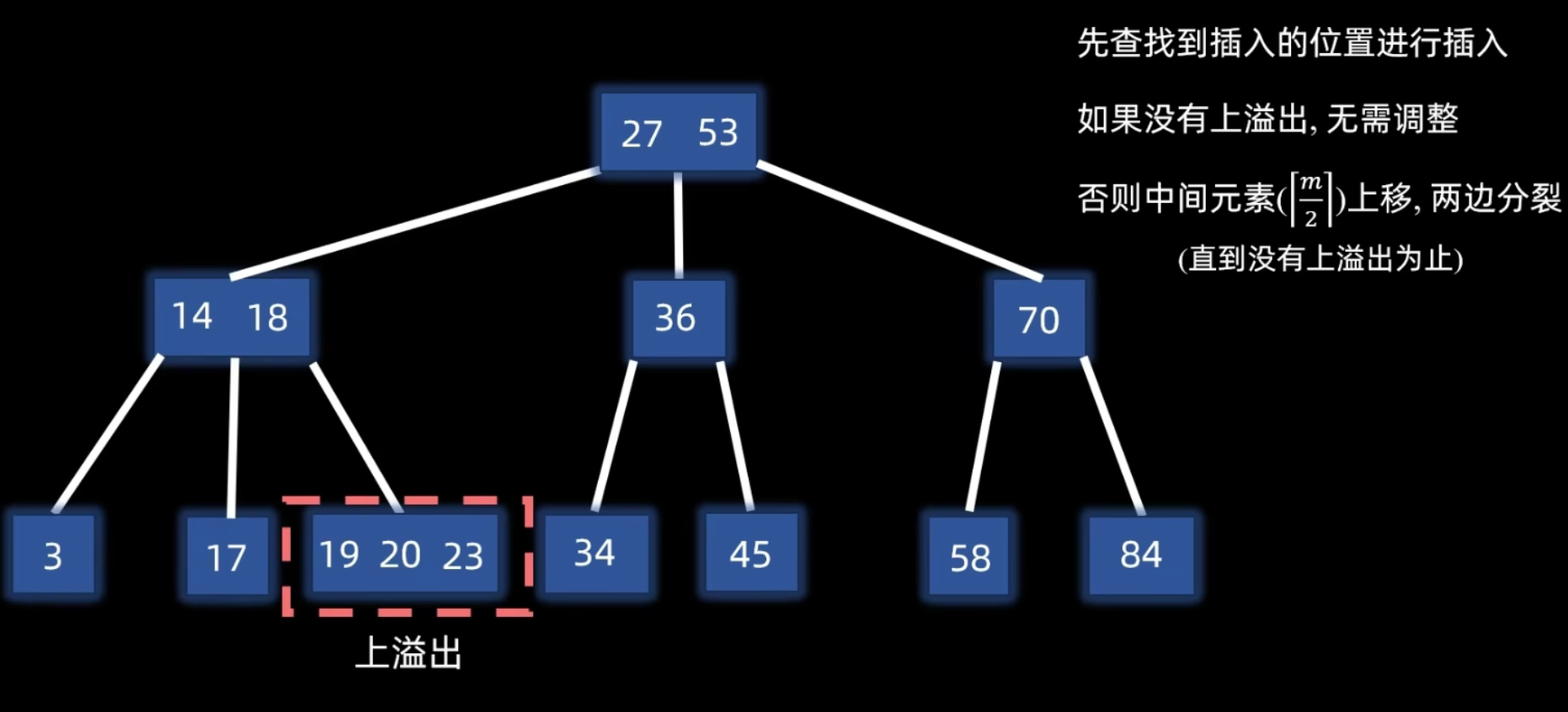 4. 递归分裂:如果因关键字提升导致父结点也溢出,则对父结点重复分裂操作,直到不再溢出或分裂到根结点。若根结点分裂,则树的高度增加 1。