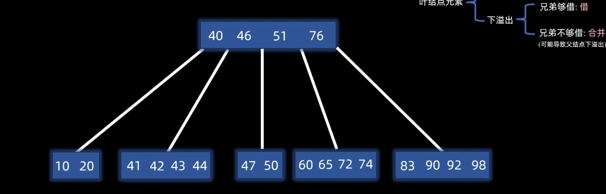 3. 递归调整:如果合并操作导致父结点发生下溢,则对父结点递归执行相同的调整策略(借用合并)。此过程可能一直向上传播到根。如果根结点的最后一个关键字被下移导致根变空,则树的高度减 1 借兄弟节点![[attachment/4511ebb82ecb8fce8d9abe0010b63a85_MD5.png|注意兄弟节点的左子树也需要借过来]] 父结点被合并