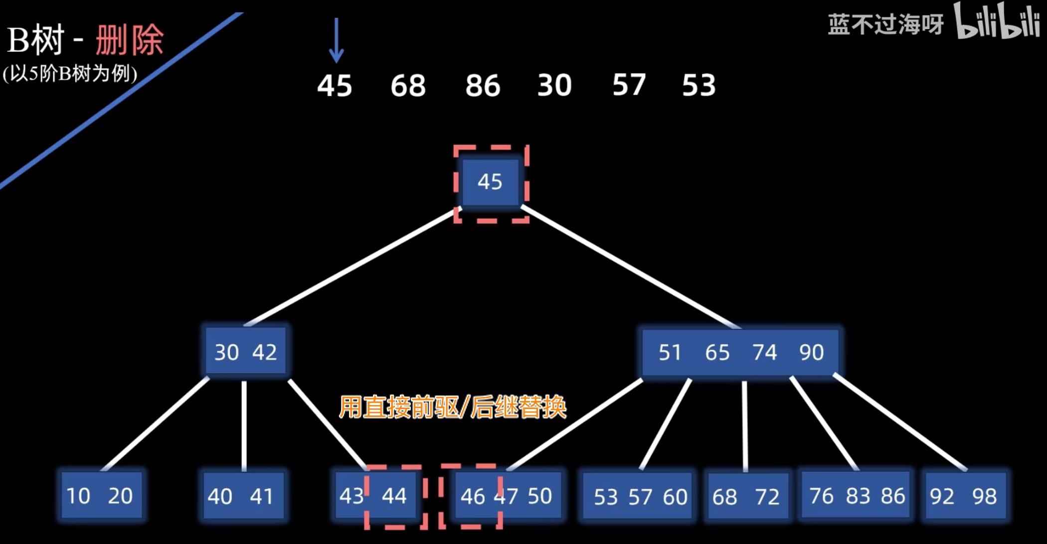 • 然后,将被用来替换的那个前驱或后继关键字从其所在的叶子结点中删除。