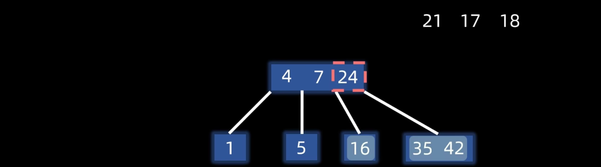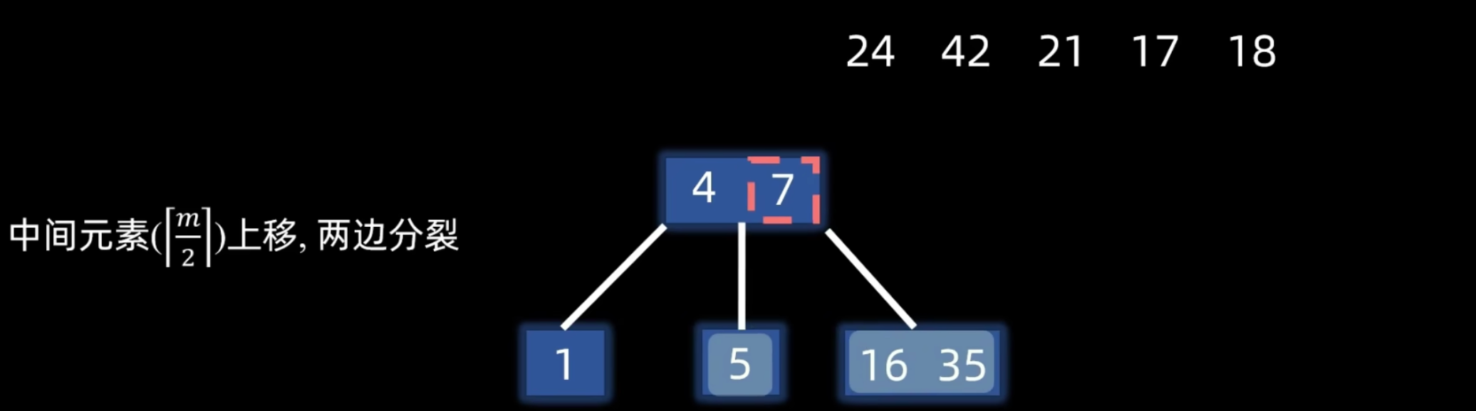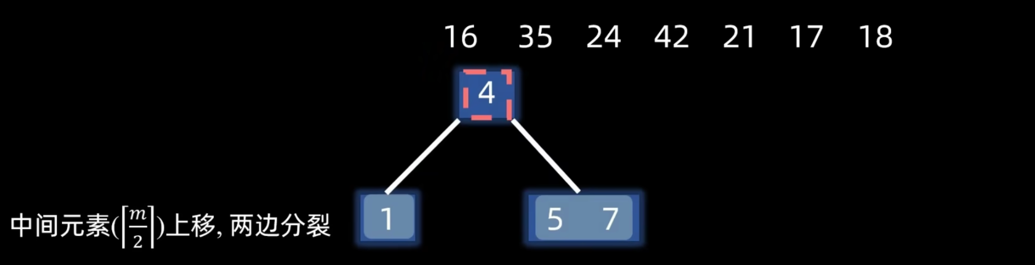• 将该结点(包含新插入的关键字,共 个)从中间位置 分裂成两个新结点(分裂完成后变为左、中、右三个部分)。