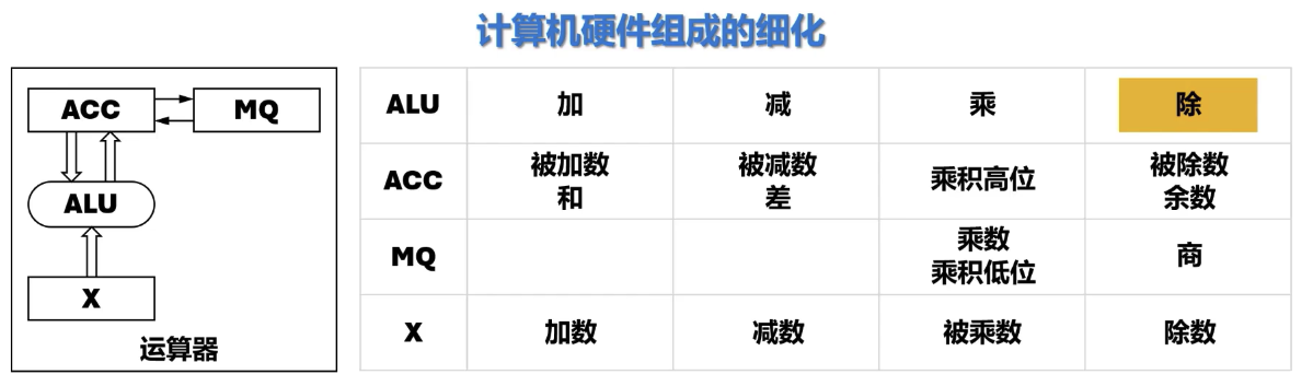 (ACC) / (X) -> MQ # 将累加器中的被除数除以X中的除数,商存入MQ,余数保留在累加器ACC控制器