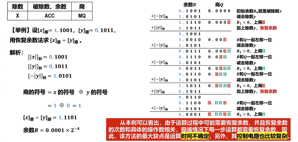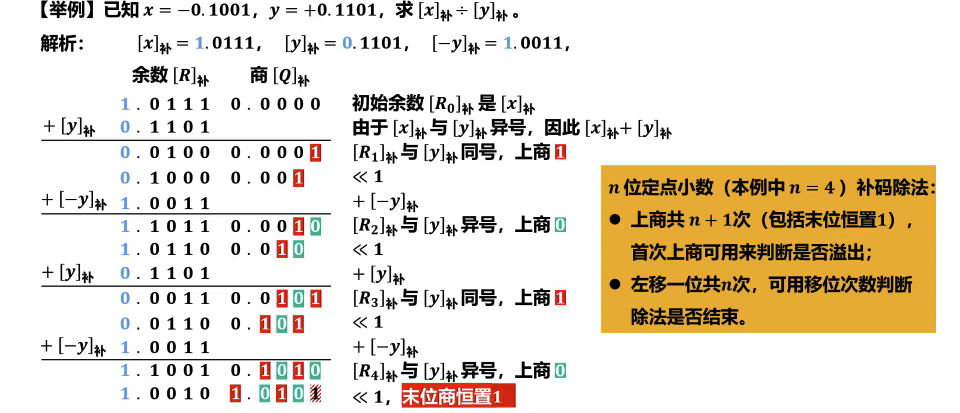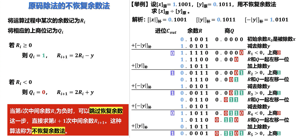 - 步骤:部分余数左移一位,减去除数,判断余数符号。若为负,商 0,恢复余数;若为正,商 1。