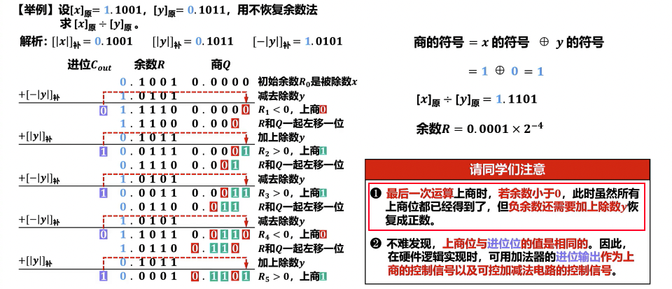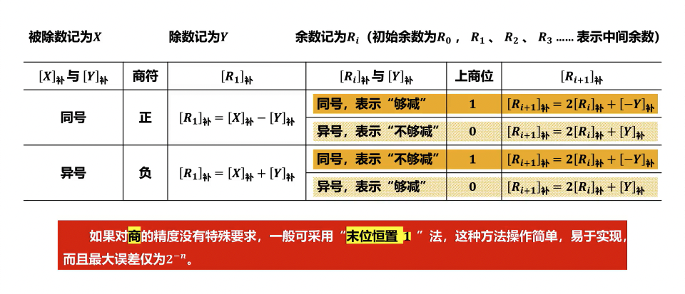 - 最终余数校正: 当所有商位确定后,若最终得到的部分余数与被除数符号不同(通常是负数),则需要进行恢复余数操作(即加上除数),以得到正确的最终余数。