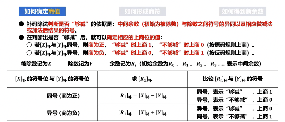 A = A + D(加上除数 D);若 A 为正,则A = A + (-D)补(减去除数 D)。 - 校正后的余数 R 应满足:R 的符号与被除数 X 的符号相同,且 |R| < |D|。
