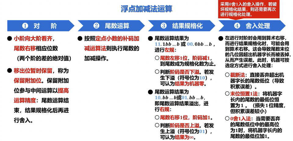 • 0 舍 1 入法:类似于四舍五入,根据被舍弃的最高位决定是否进位。若舍入后破坏了规格化结果,则还需要再次进行规格化处理。