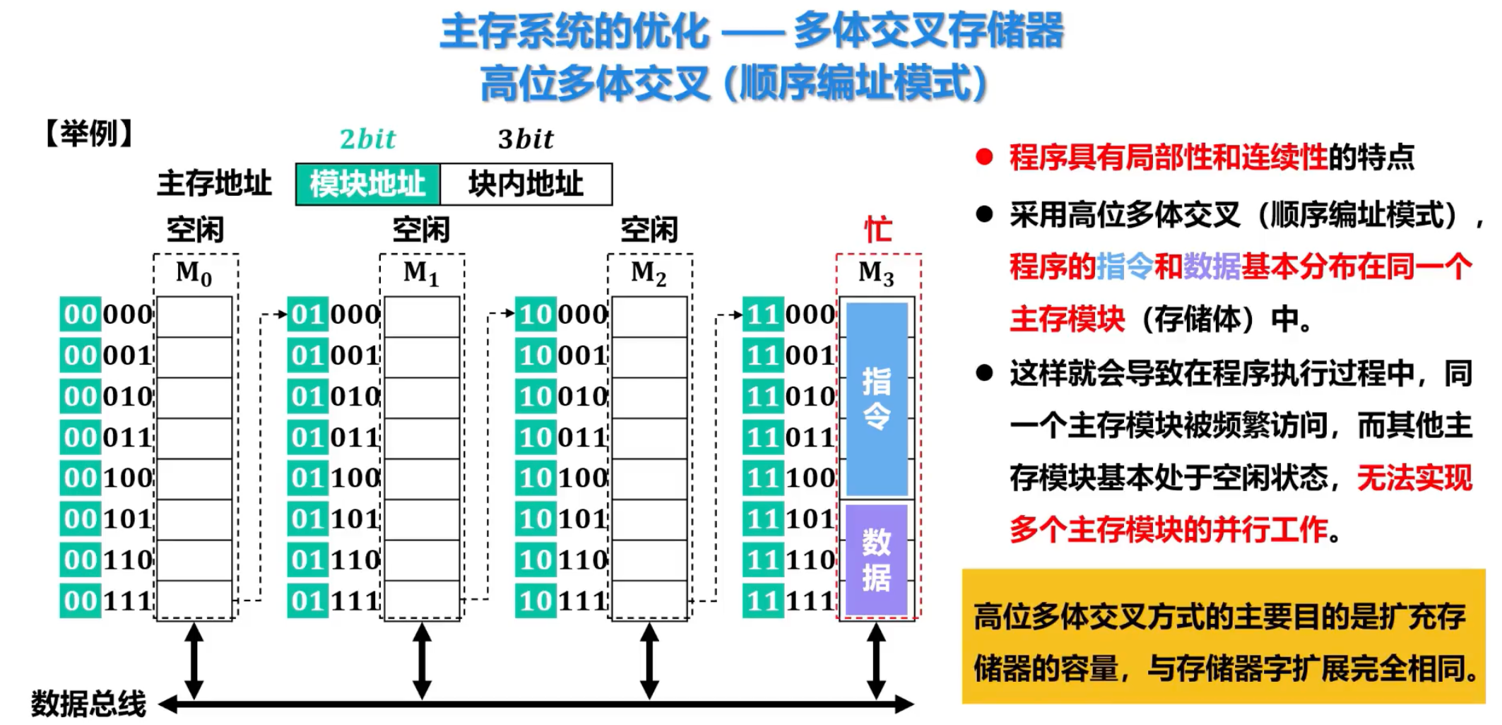 - 优点:对连续字的成块传送可实现多模块并行存取,提高了存储器的带宽