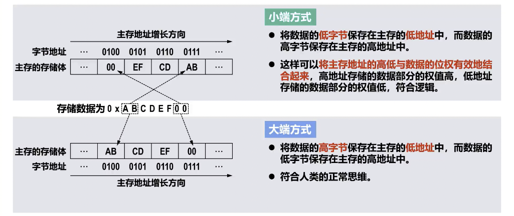 - 小端方式:将数据的低字节保存在主存的低地址中,而数据的高字节保存在主存的高地址中。