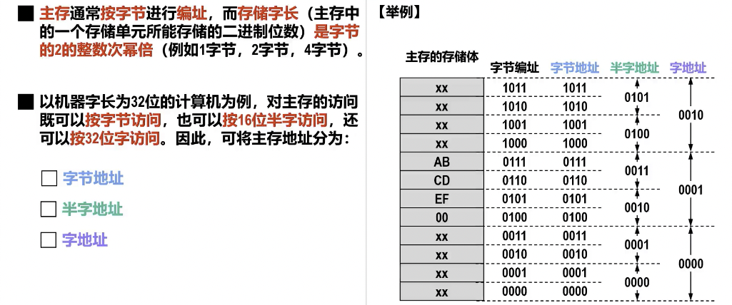 - 存放一个机器字的存储单元,通常称为字存储单元,相应的单元地址叫字地址
