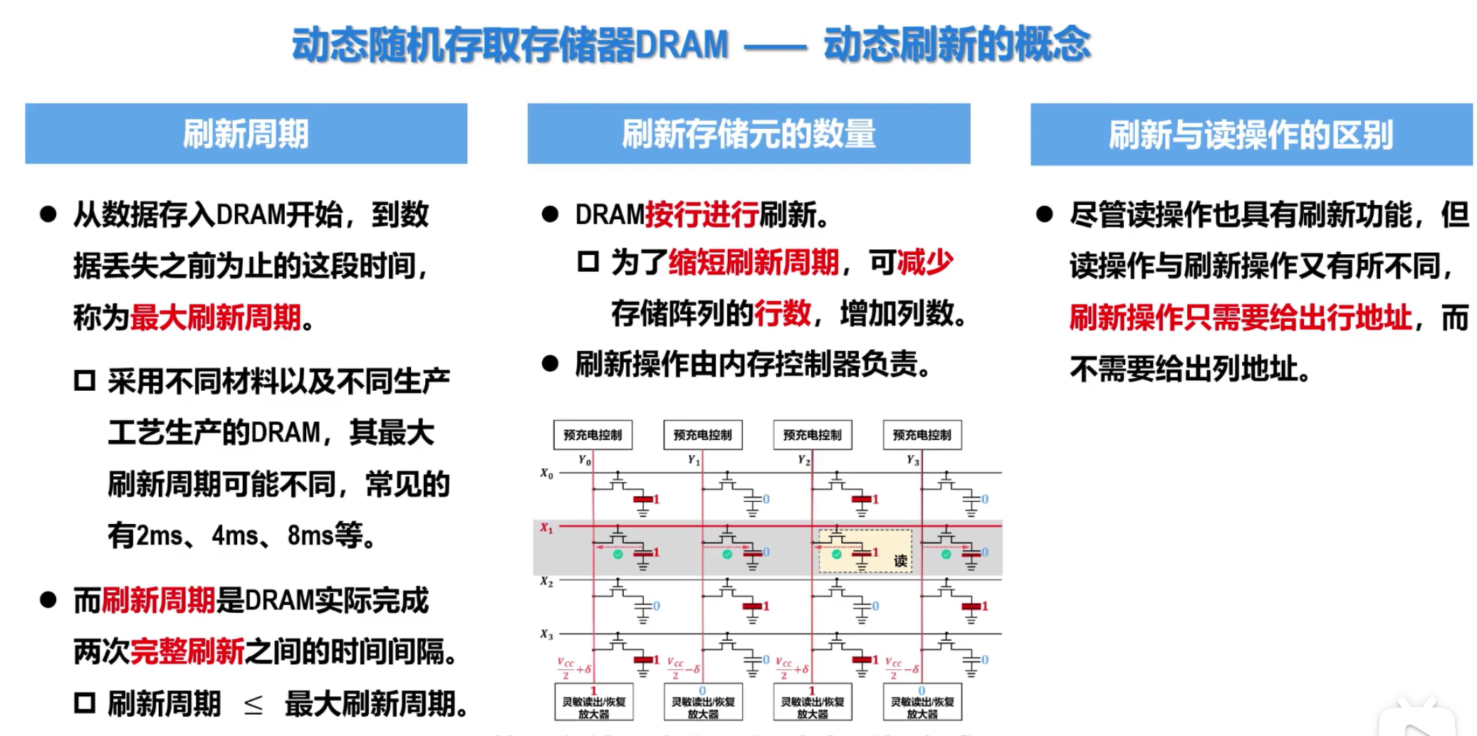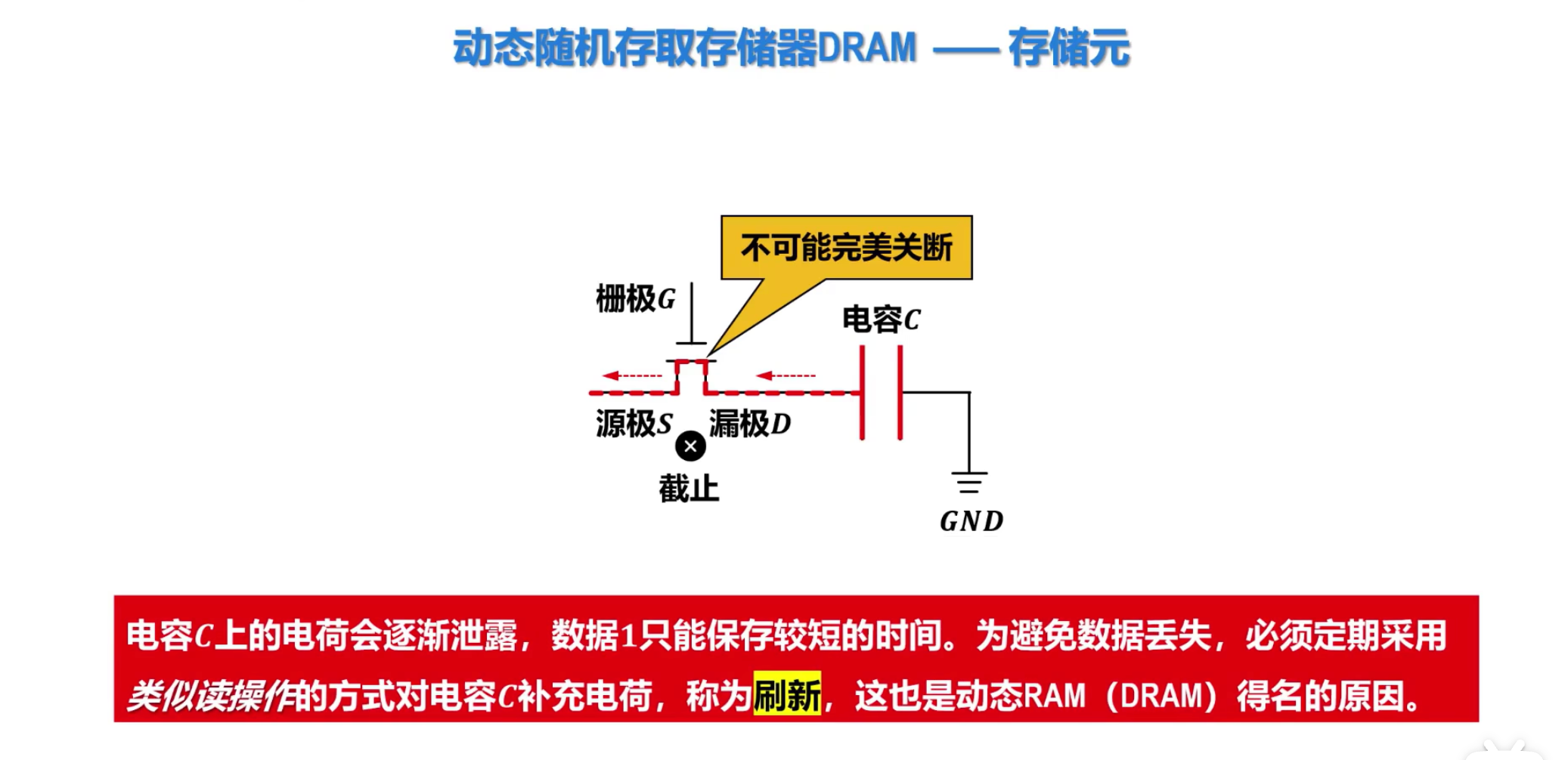 - 所谓“动态”,是指其存储的数据需要周期性地刷新(即重新充电),才能保持数据不丢失。这是因为其存储单元是利用电容存储电荷来表示数据,而电容上的电荷会随着时间泄漏。