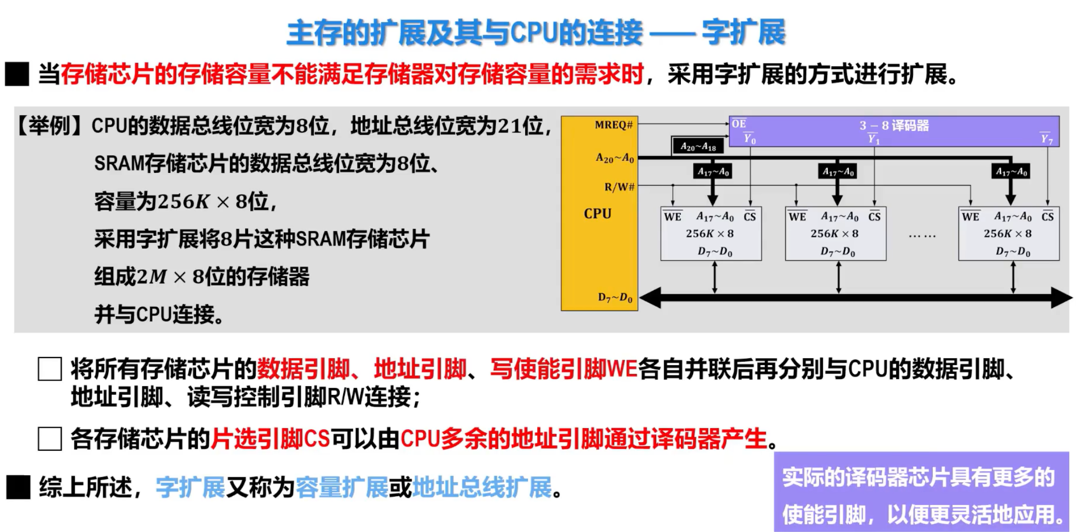- 片选线 CS:确定哪个存储芯片被选中,可用于容量扩充