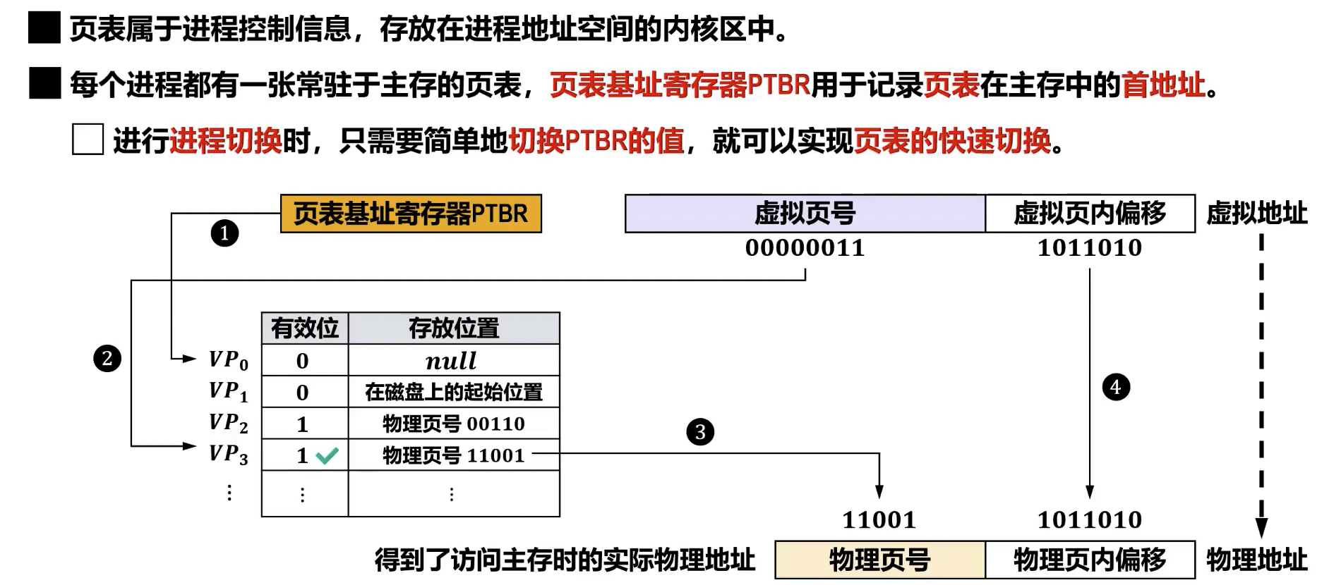 - 页表基址寄存器 (Page Table Base Register, PTBR) 存储当前进程页表的起始物理地址。