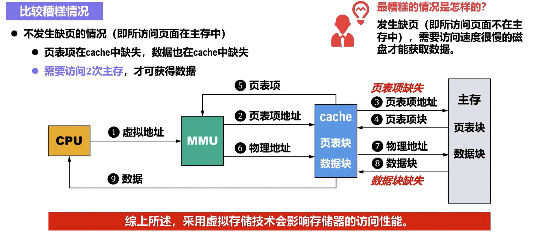 - 如果 Cache 中也没有,则必须访问主存来获取页表项。