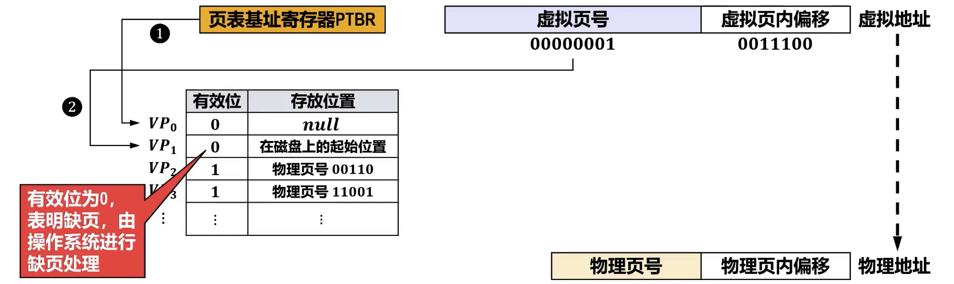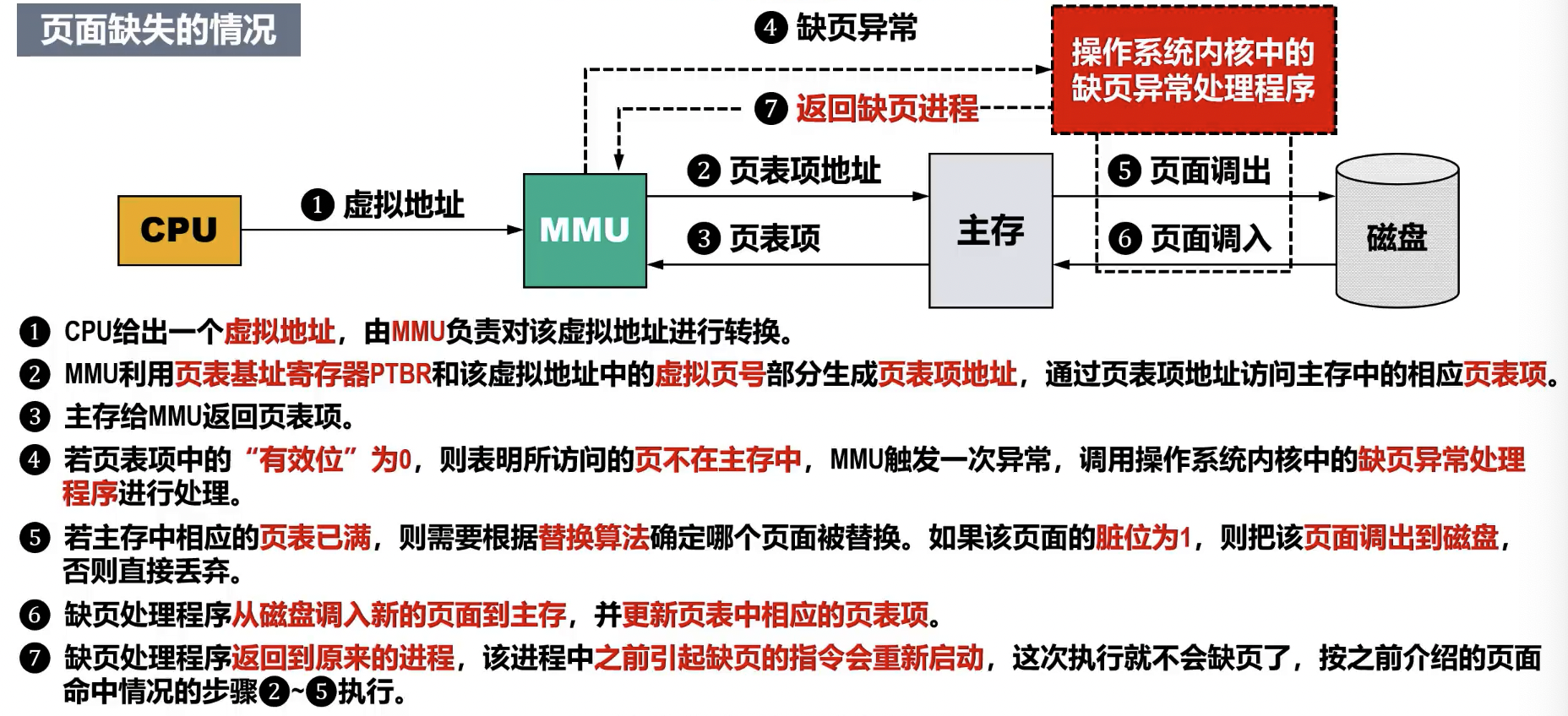 - 若有效位为 0,则发生缺页中断 (Page Fault)。此时,操作系统会接管控制权,缺页处理程序从磁盘(辅存)调入所需的虚拟页到主存(物理内存)中的一个空闲物理页框,并更新相应的页表项,将有效位设置为 1,并填入新的物理页框号 PPN。