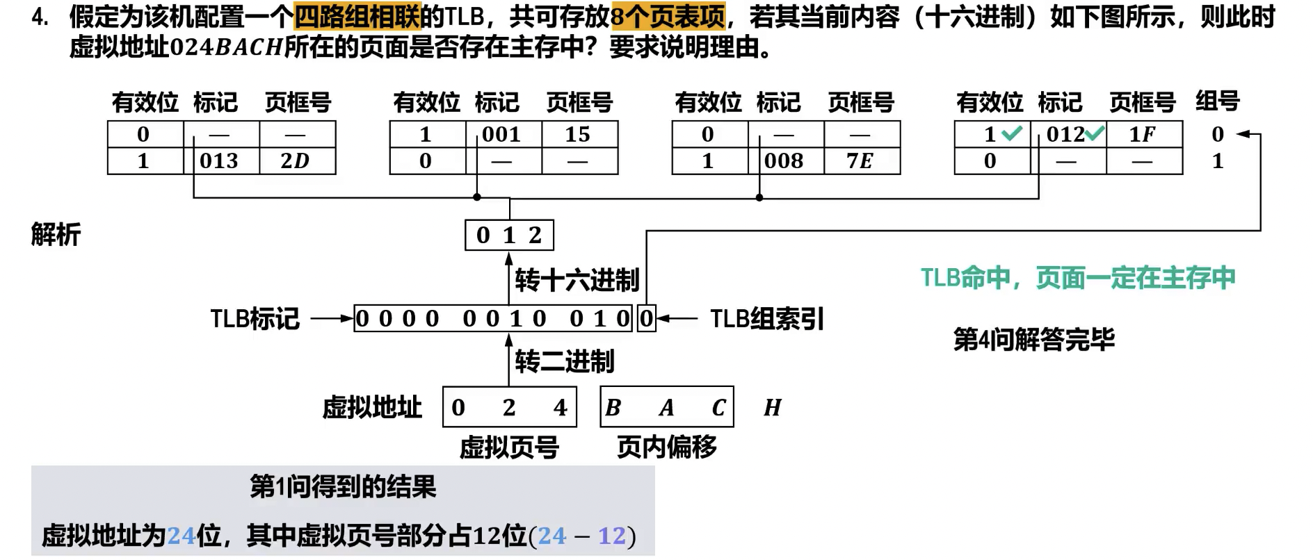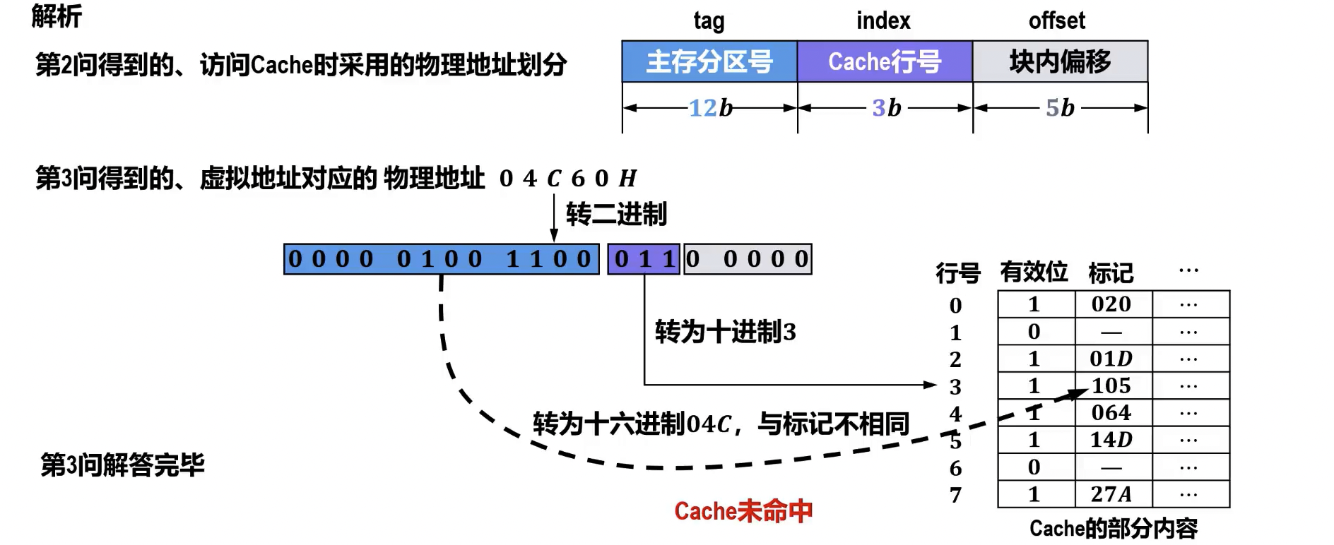 | 4 | 缺失 | 命中 | 缺失 | 可能 | TLB 未命中,查页表得到物理地址,数据也不在 Cache 中,需访问主存。 |