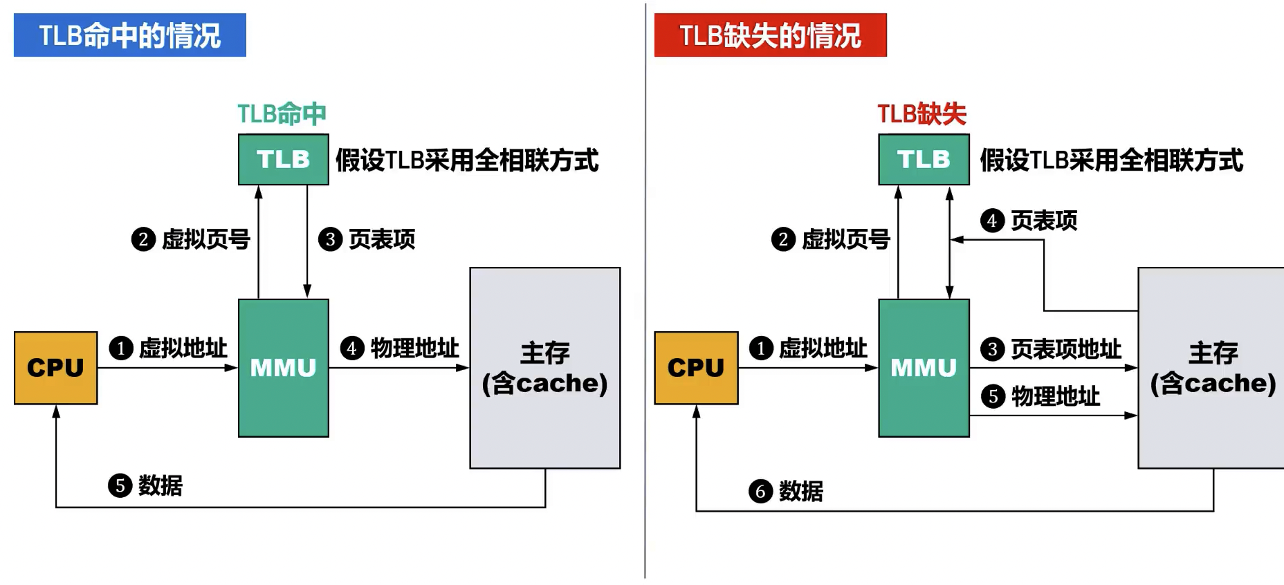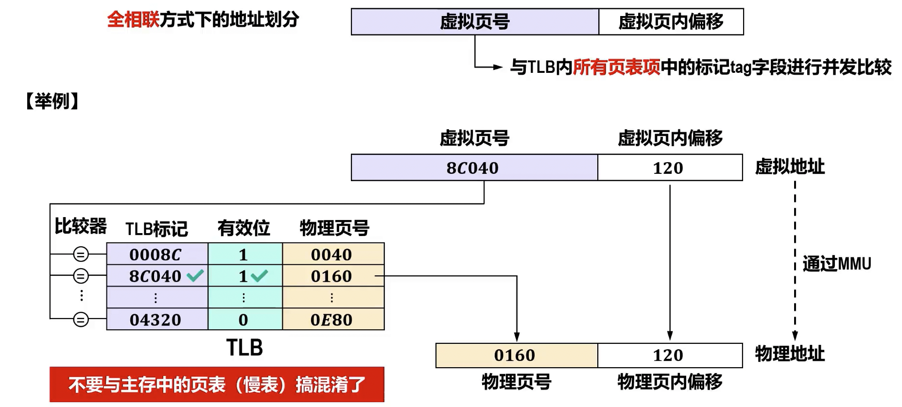 - 可将 TLB 看作是一个容量较小的 cache(只不过仅用于缓存经常访问的页表项,数据项仍在 cache 中缓存),由于 TLB 的访问速度远高于主存,因此通常将 TLB 表称为快表,相应地将主存中的页表称为慢表。