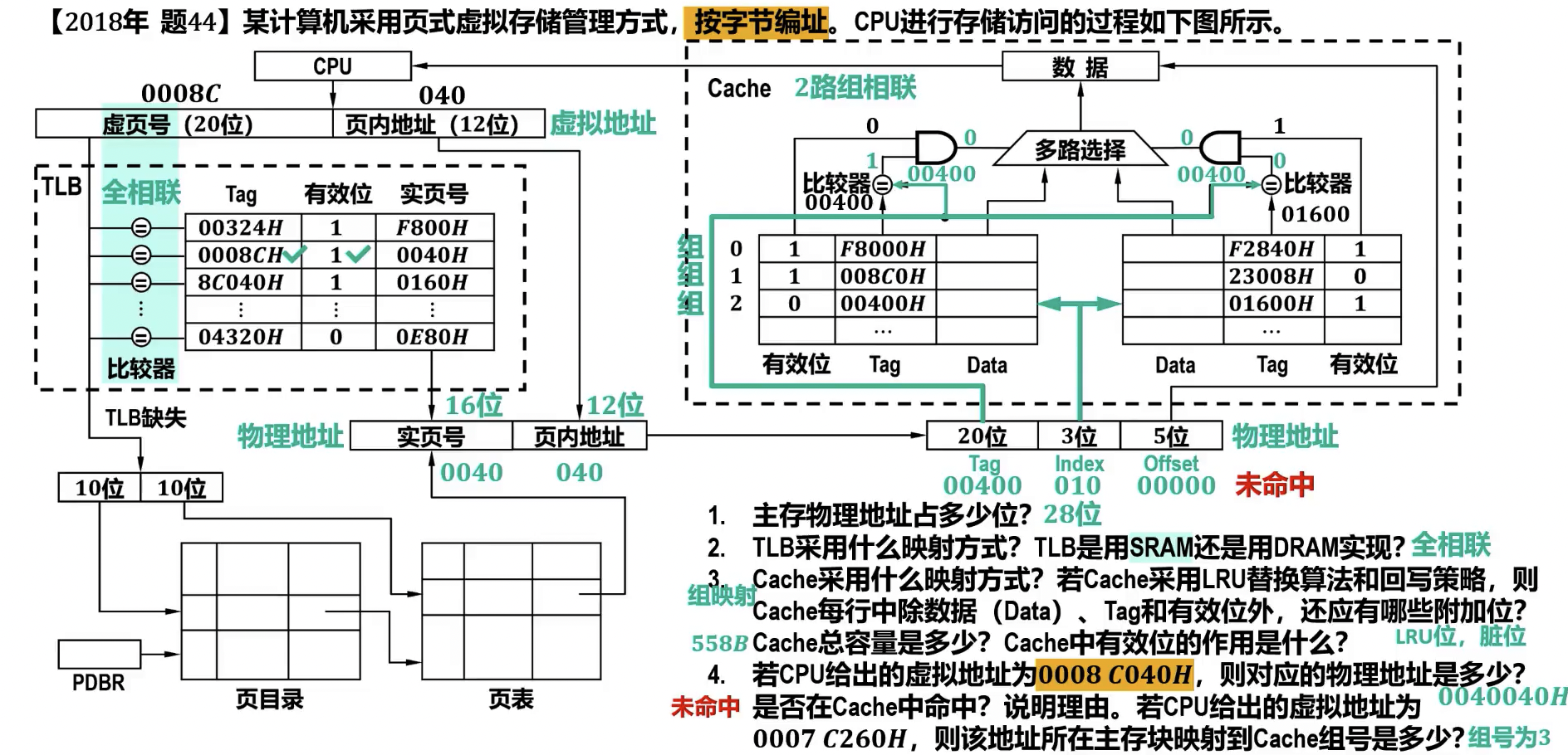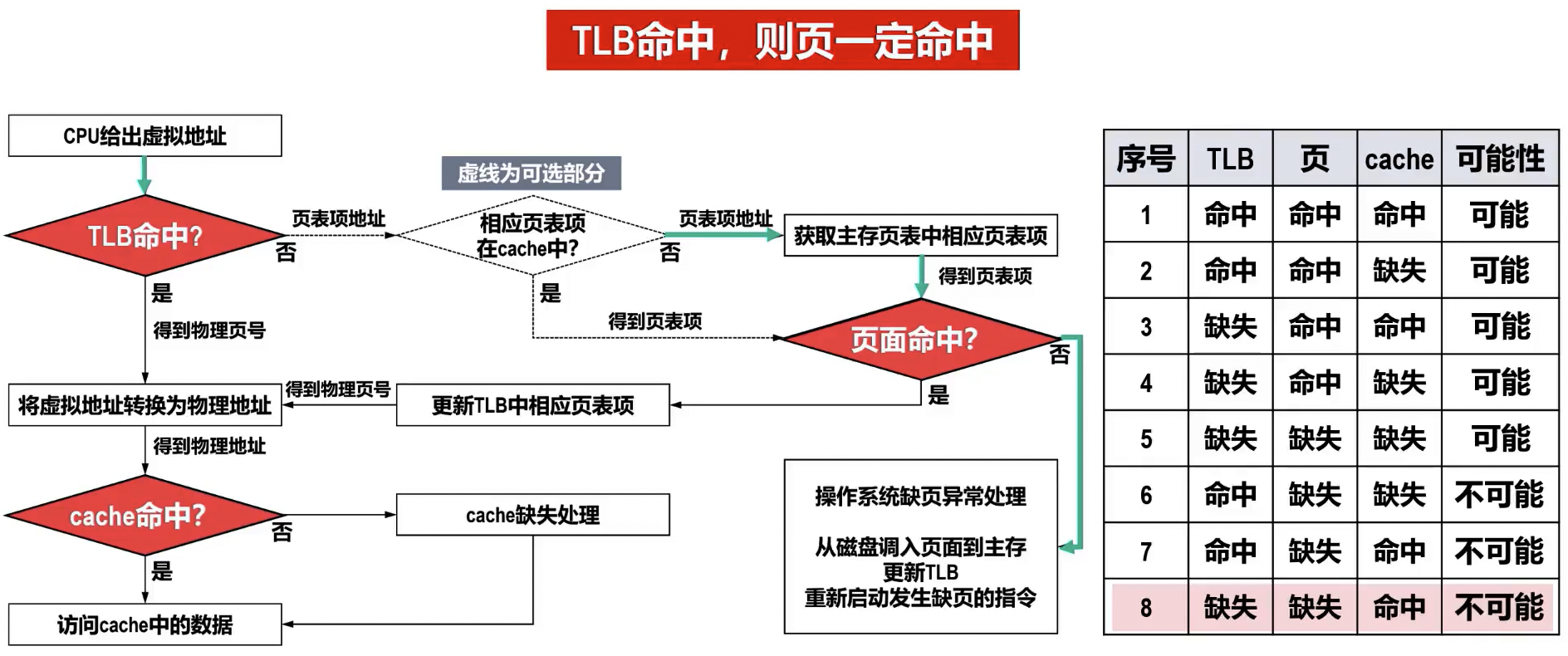 | 8 | 缺失 | 缺失 | 命中 | 不可能 | 如果发生缺页 (Page Fault),说明数据根本不在物理内存中。由于 Cache 是主存的子集,数据也绝不可能在 Cache 中。只有在确定物理地址后才会查询 Cache。 |