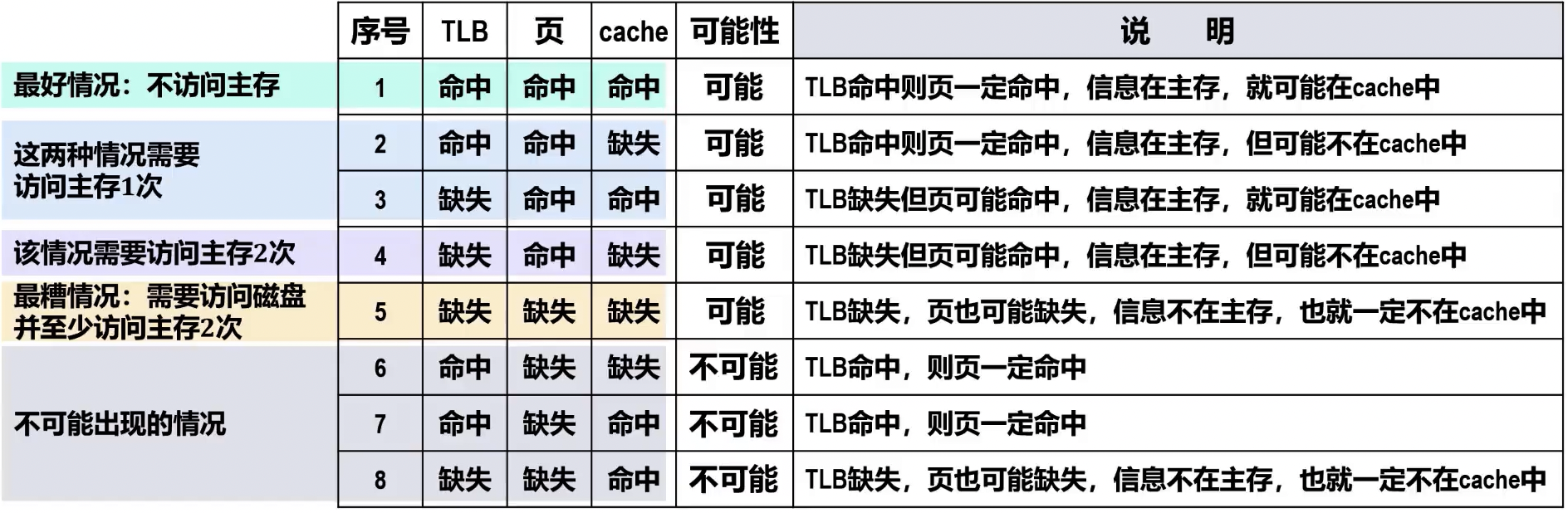 | 7 | 命中 | 缺失 | 命中 | 不可能 | 同上,TLB 命中时不可能发生缺页。 |