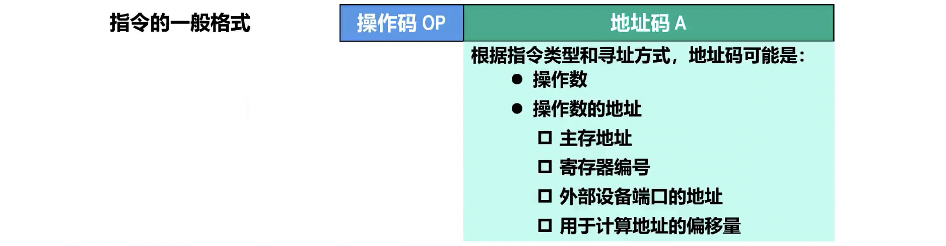 - 地址码:指令中指出操作数或指令的地址的部分。地址码的位数决定了指令能直接寻址的范围。