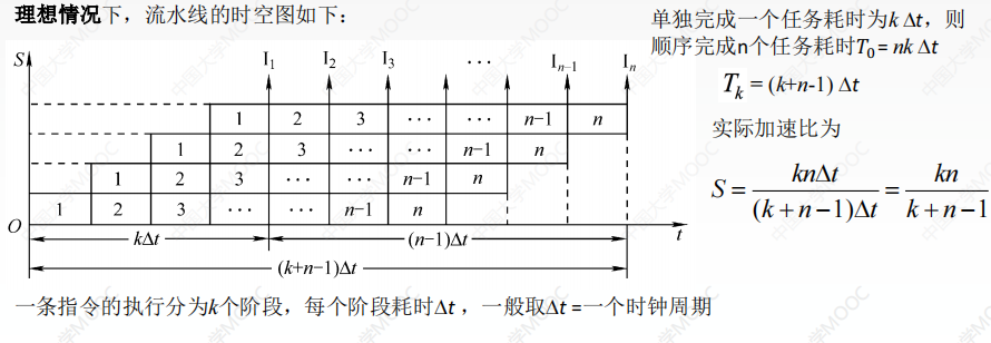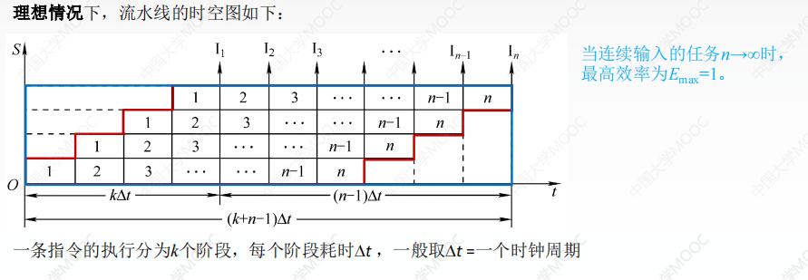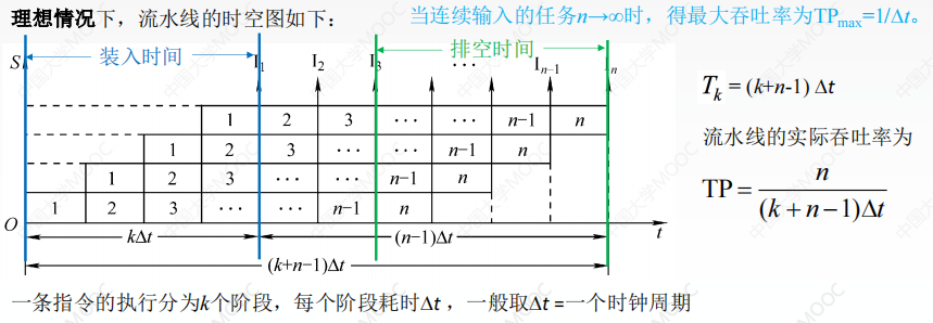 - 效率:流水线的设备利用率,在时空图上,表示为完成 n 个任务占用的时空区有效面积与 n 个任务所用的时间与 k 个流水段所围成的时空区总面积之比