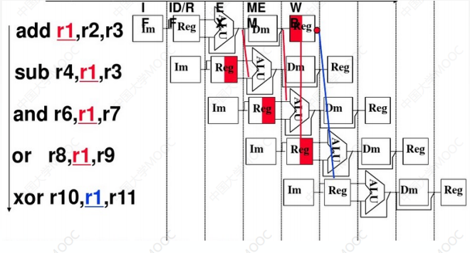 转发(旁路)技术:设置相关转发通路,不等前一条指令把计算结果写回寄存器,下一条指令也不再从寄存器读,而将数据通路中生成的中间数据直接转发到 ALU 的输入端