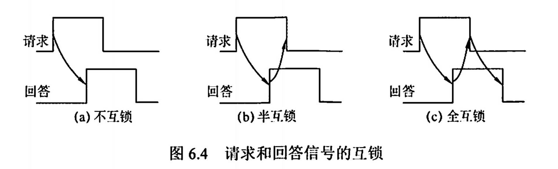 • 主设备发出“请求”信号后,必须待接到从设备的“回答”信号后,才撤销“请求”信号,存在互锁关系。