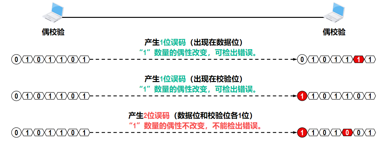 - 偶校验:是在待发送的数据后面添加 1 个校验位,使得添加该校验位后的整个数据中比特 1 的个数为偶数