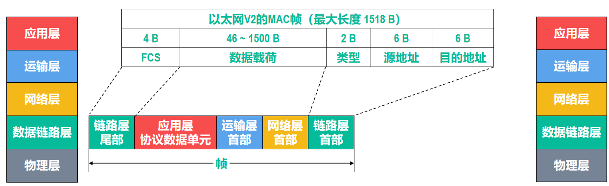 - 为了提高帧的传输效率,应当使帧的数据载荷的长度尽可能地大于首部和尾部的长度