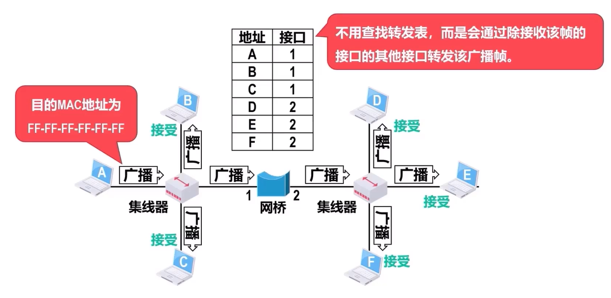 - 如果网桥收到一个无误码的广播帧,则不用进行查找,而是直接转发