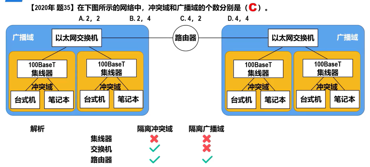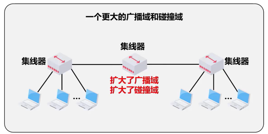 - 集线器既扩大了广播域又扩大了冲突域