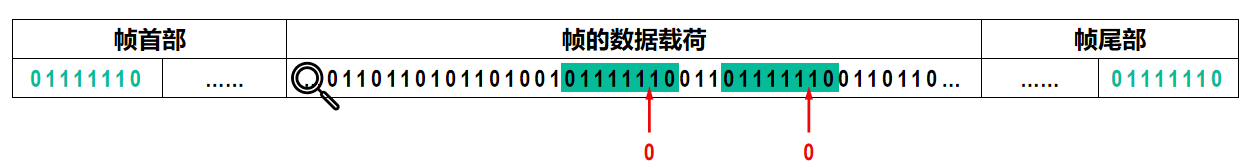 - 接收方处理:对帧的数据载荷进行扫描,每出现5 个连续的比特 1时,就把其后的一个比特 0 删除