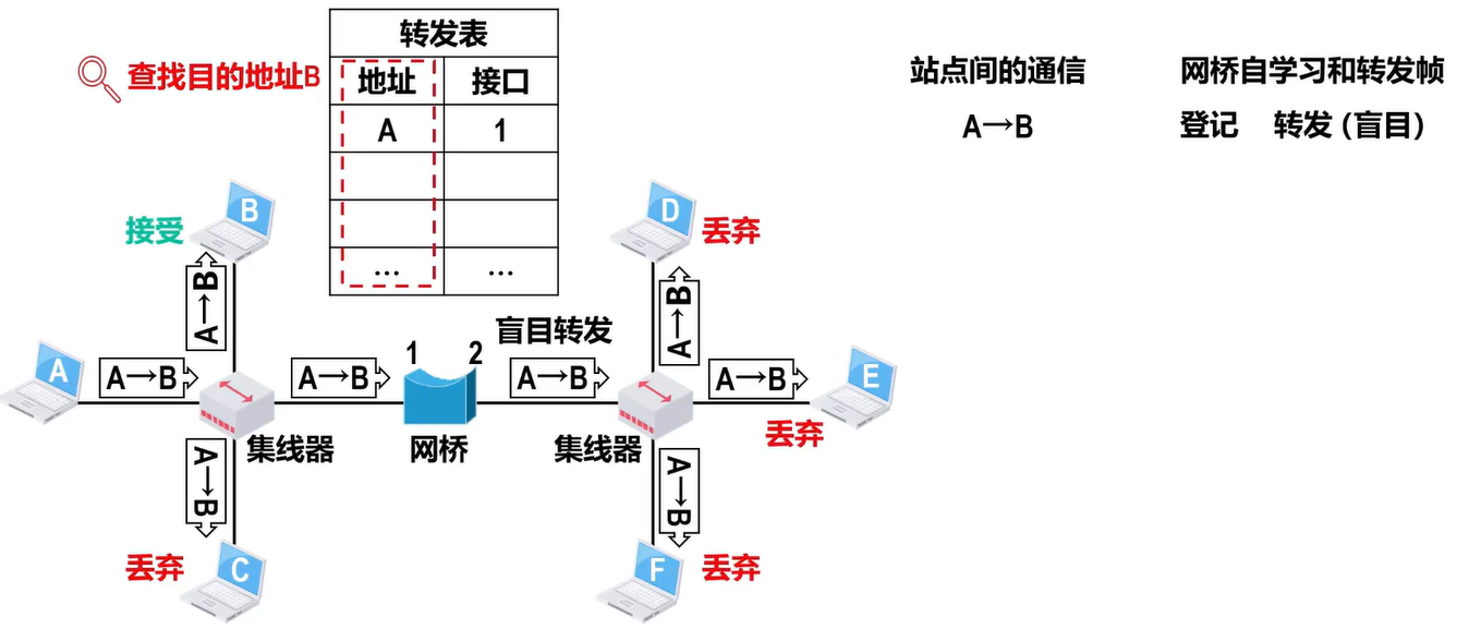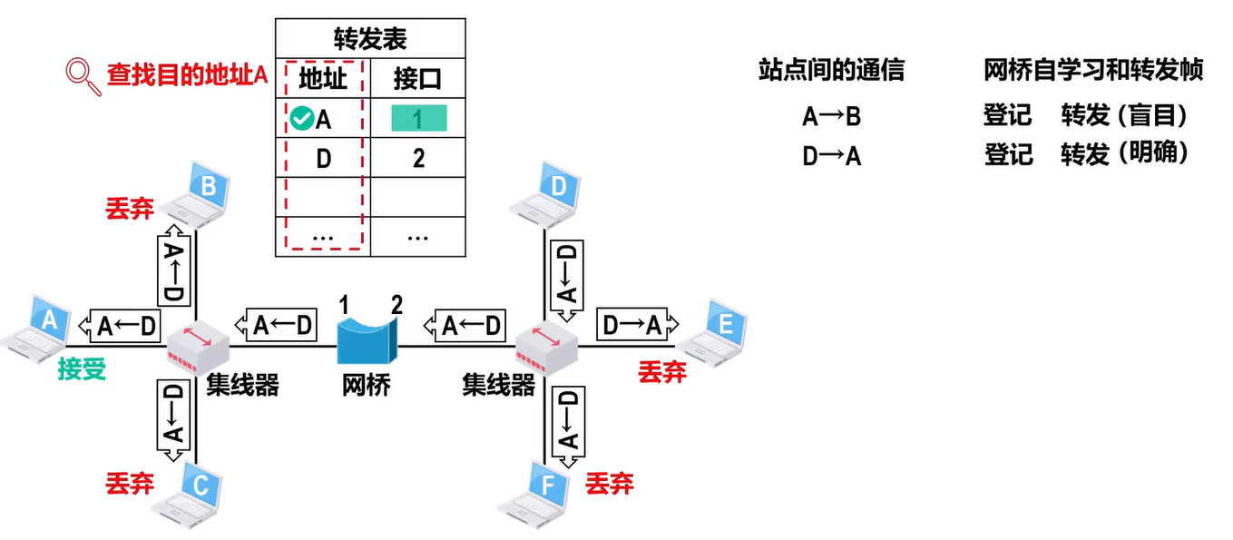 - 根据帧首部中的目的 MAC地址和网桥自身的帧转发表来转发或丢弃所收到的帧