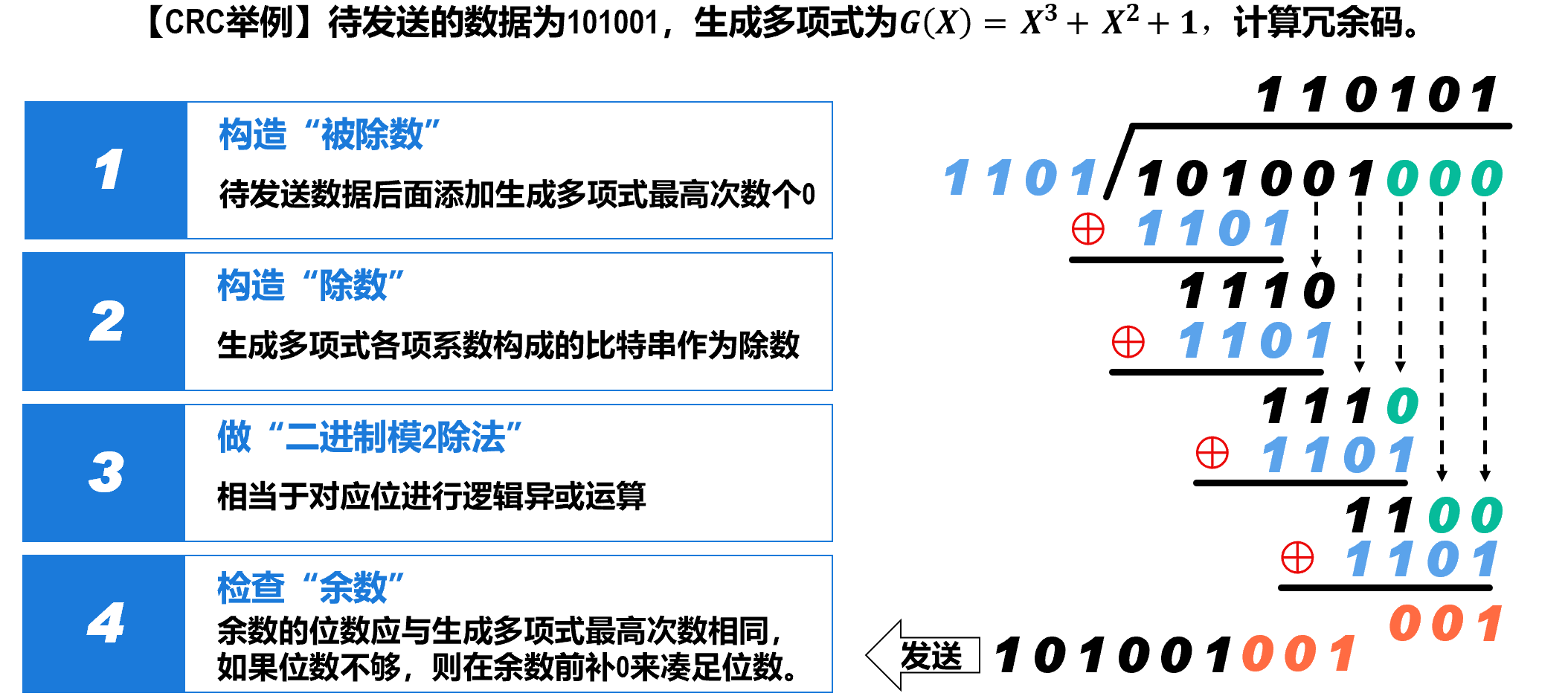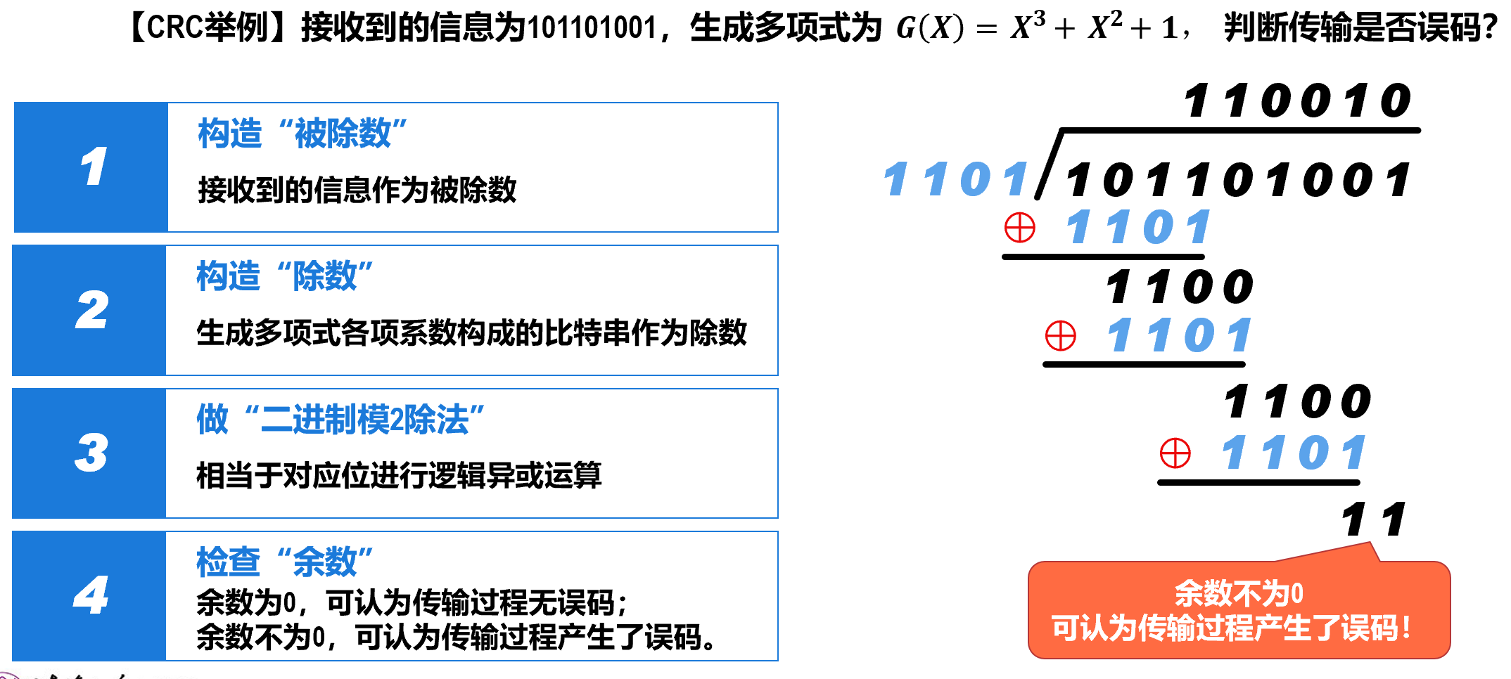 - 接收方处理:只需要反变换可恢复出原来的帧的数据部分