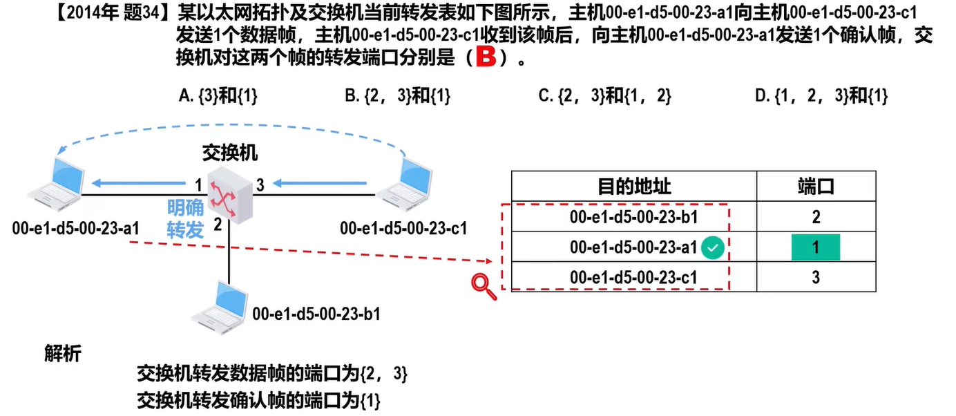 - 交换式以太网:交换机收到帧后,根据帧的目的 MAC 地址和自身的交换表将帧明确地转发给目的主机