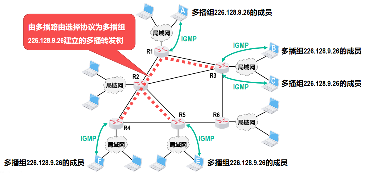 - 为了覆盖多播组的所有成员,多播转发树可能要经过一些没有多播组成员的路由器**