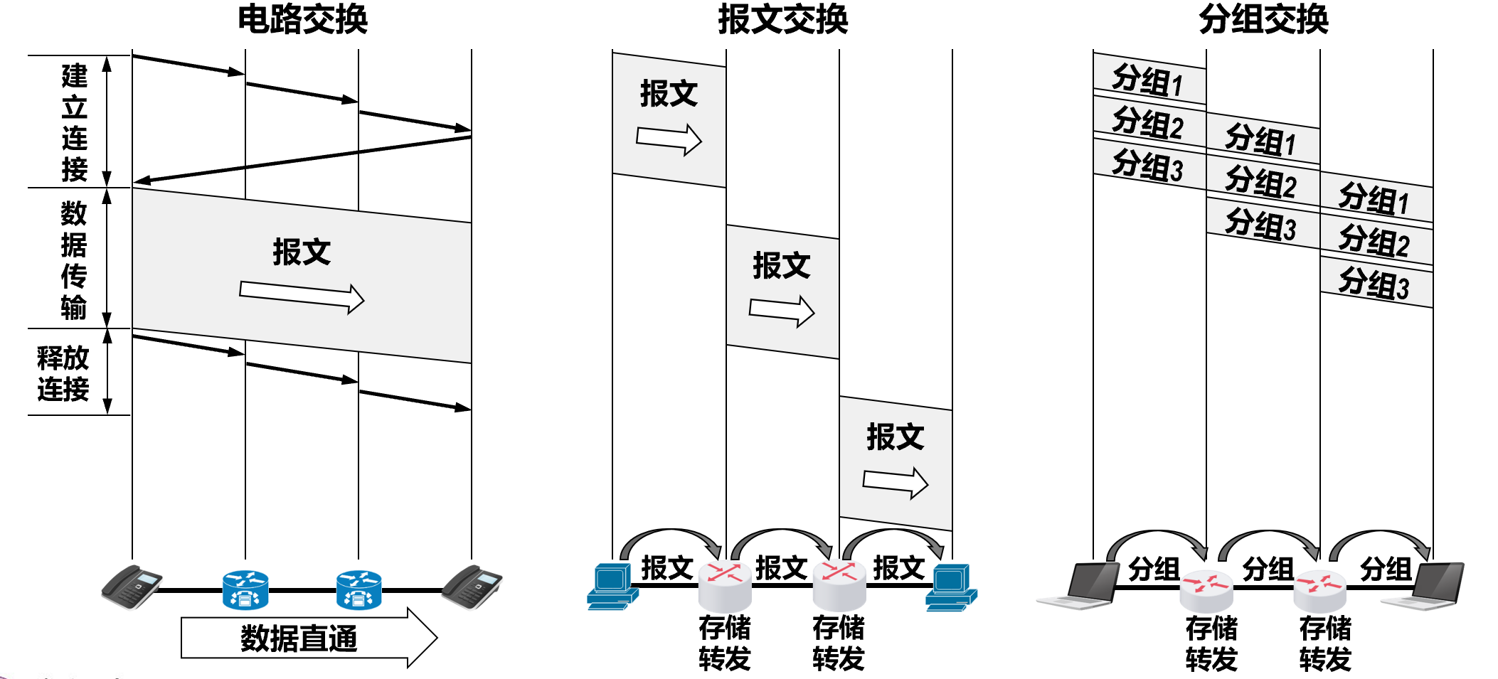 • 电路交换:建立连接时间 + 总传播时延 + 发送时延
