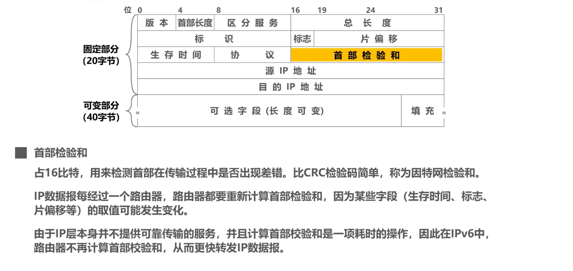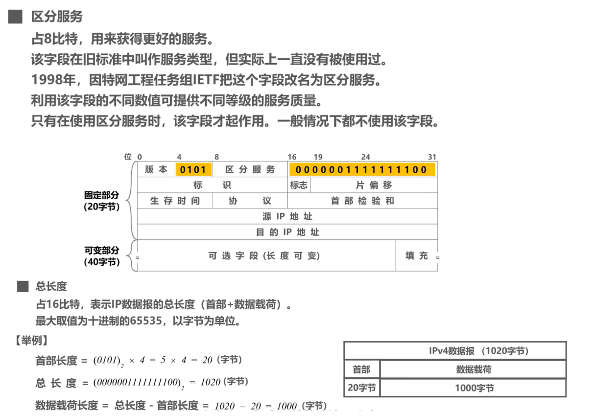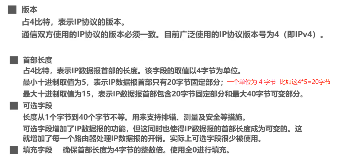 • 首部的前一部分是固定长度,共 20 字节,是所有 IP 数据报必须具有的。
